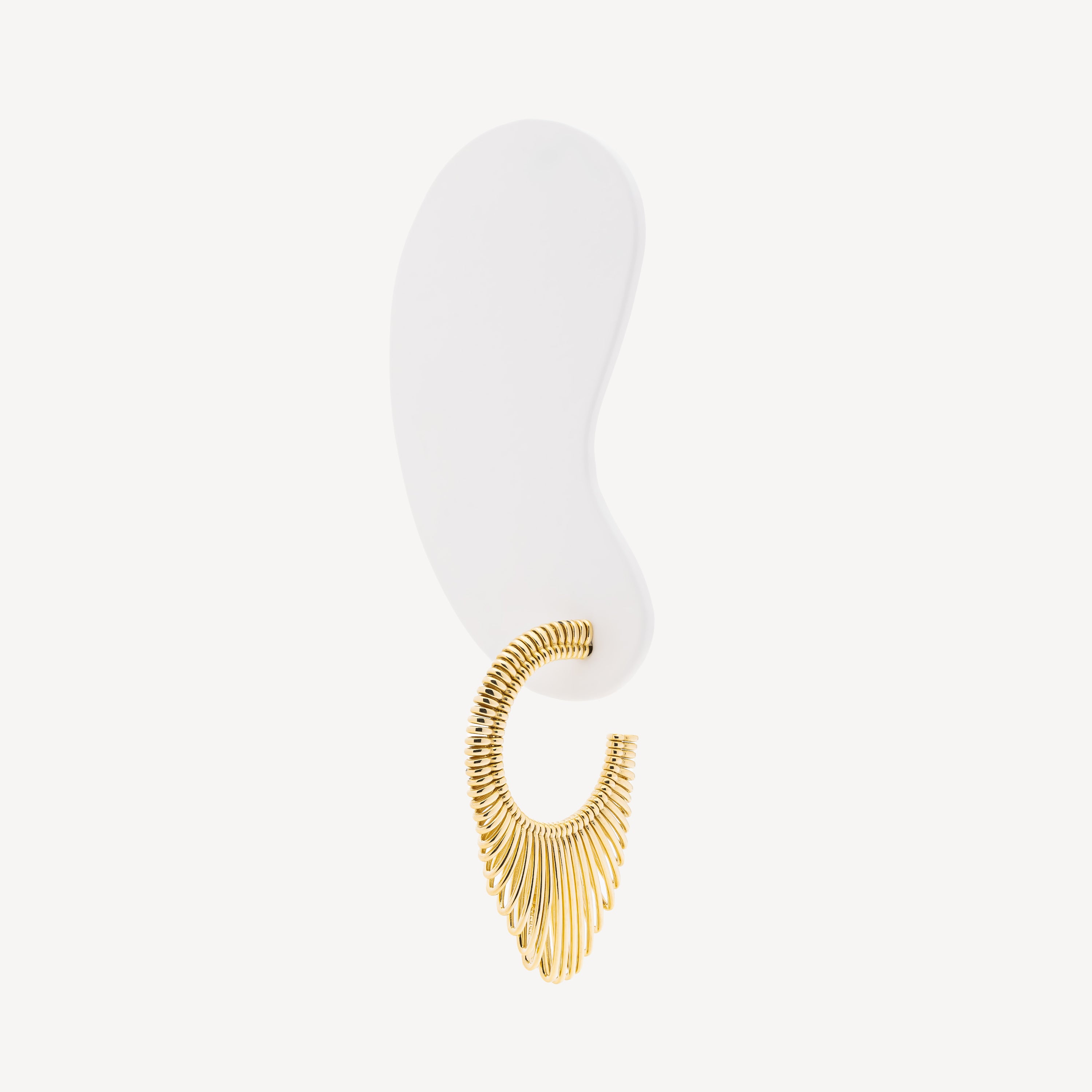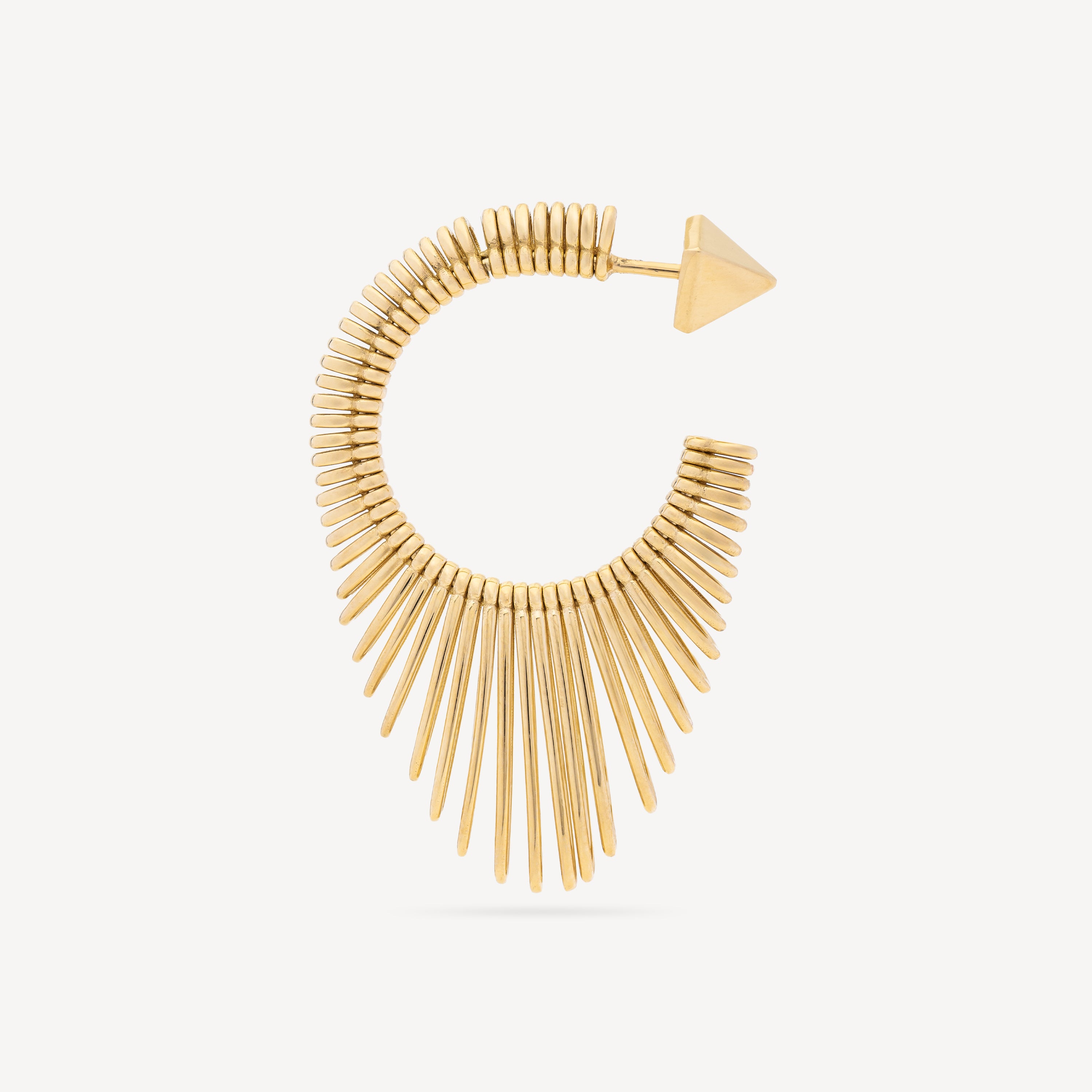 Boucle d'oreille en or jaune composée d'éléments mobiles filiformes de différentes longueurs disposés de manière radiale.
