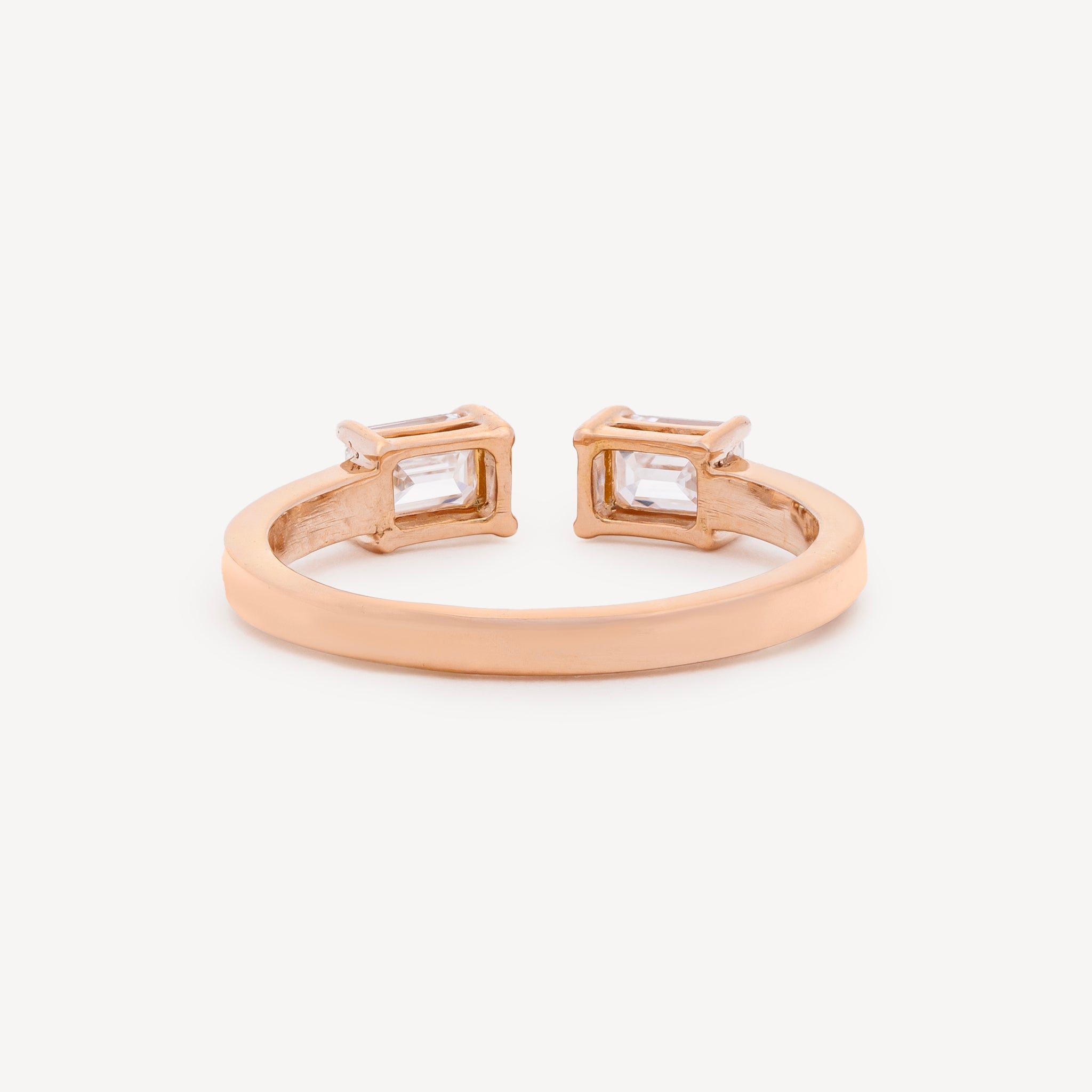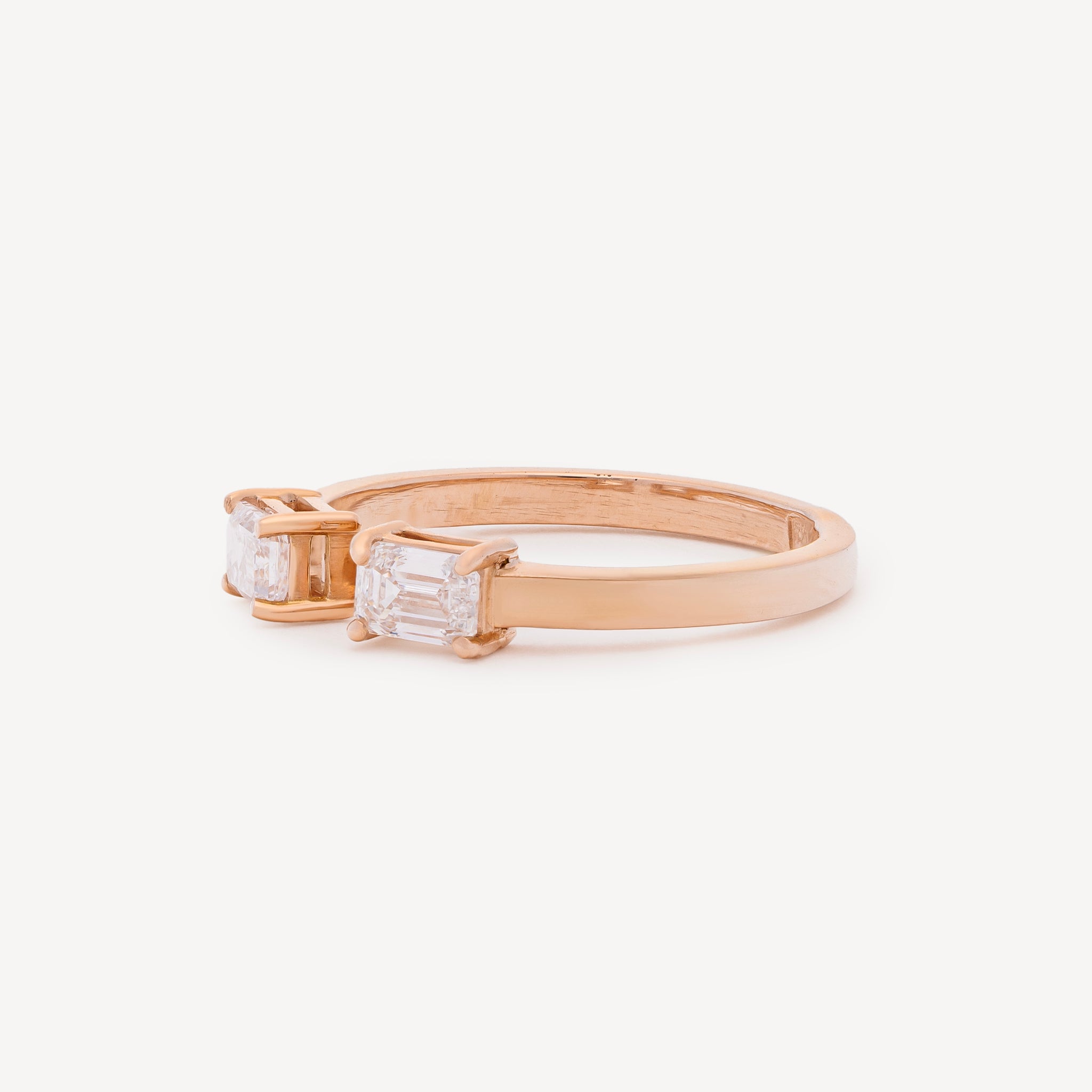 Cette bague en or rose se distingue par son design élégant où deux diamants blancs taille émeraude sont disposés en opposition, créant un jeu de lumière raffiné. Éclat de pureté et de puissance, le diamant blanc symbolise la clarté, l’élégance éternelle et la force intérieure