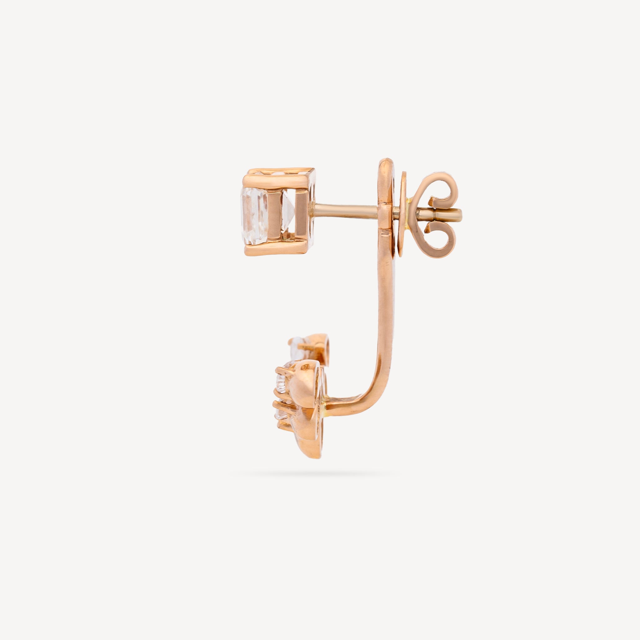 Cette boucle d’oreille en or rose met en valeur un dessous d'oreille composé de cinq diamants blancs taillés en poire sur un stud avec diamant taille Asscher, offrant un équilibre parfait entre élégance classique et modernité. Éclat de pureté et de puissance, le diamant blanc symbolise la clarté, l’élégance éternelle et la force intérieure.