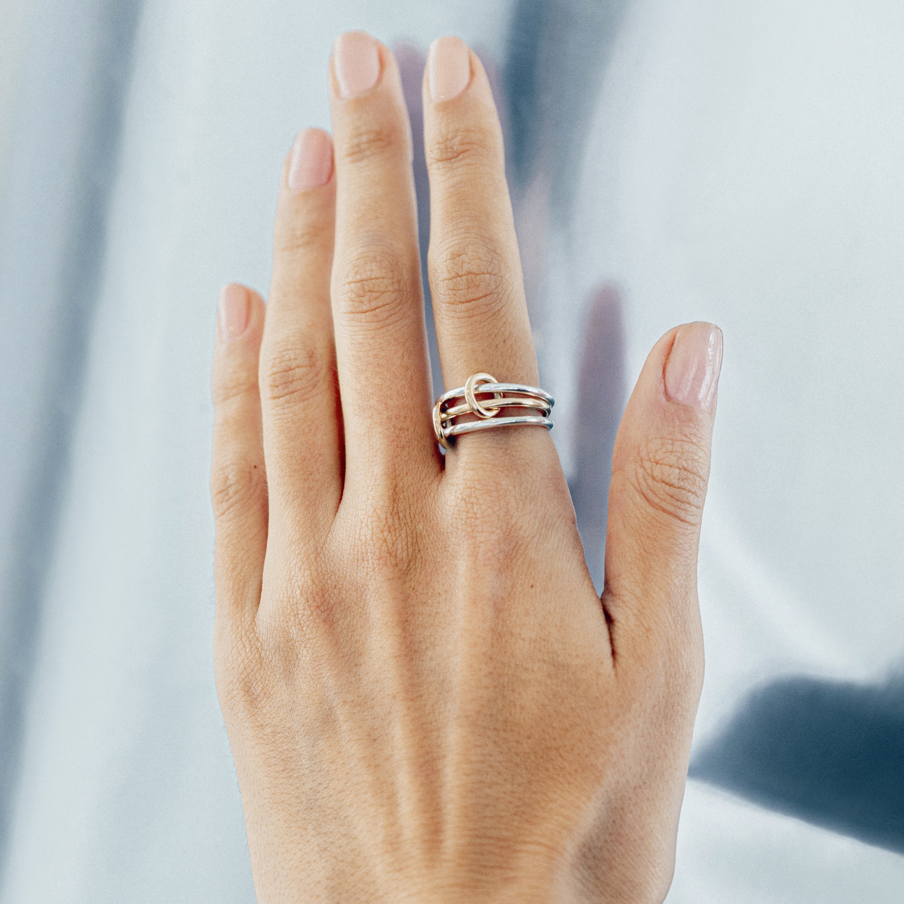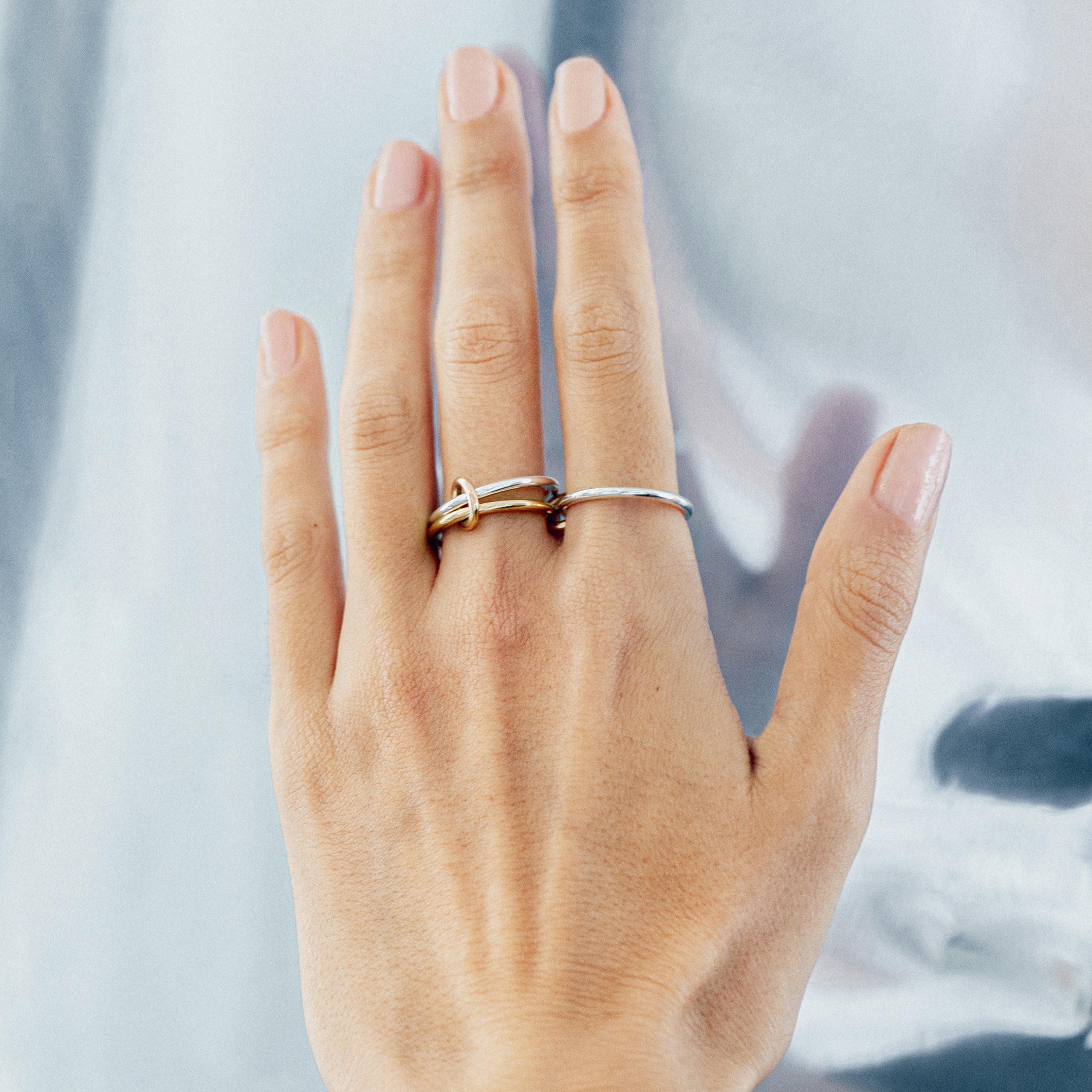 La bague Solarium joue sur des palettes lumineuses, unies ou multicolores, avec des bandes et connecteurs fins et élégants. Son design modulable permet de la porter sur un ou plusieurs doigts.
