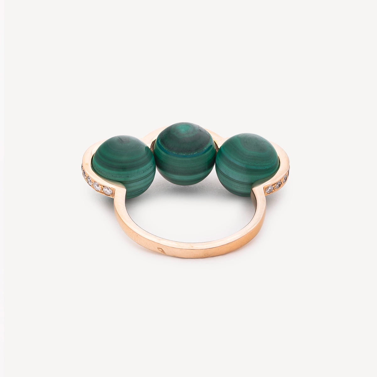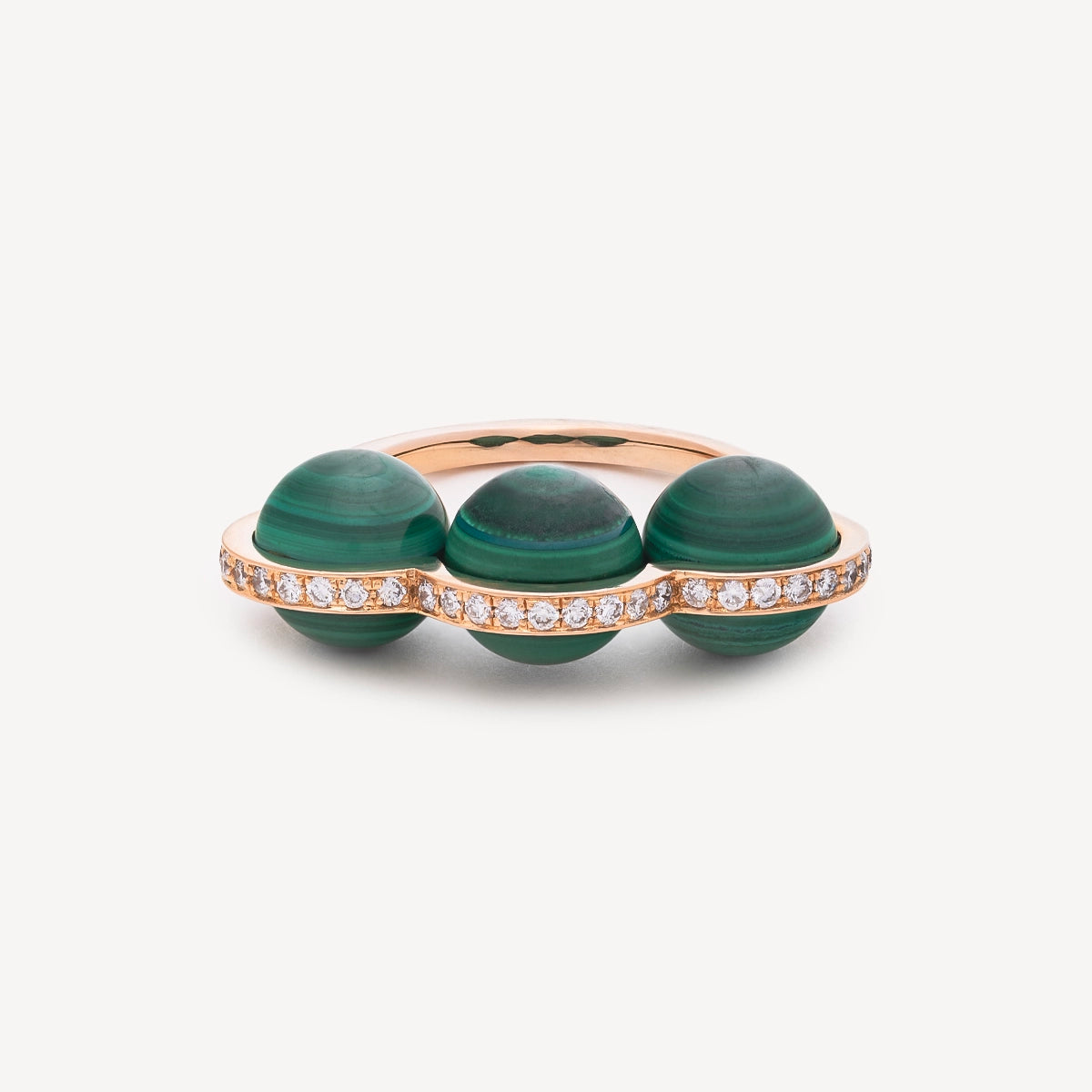 La bague La Réserve Malachite et Diamant de D1928 affirme une élégance magnétique. Trois malachites centrales, aux nervures vert profond et hypnotiques, s’alignent comme un manifeste minéral, tandis qu’un pavage de diamants blancs illumine le dessus d’un éclat vibrant. L’alliance de la malachite et du diamant blanc crée une énergie d’équilibre, favorisant l’alignement et l’élévation personnelle.