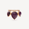 Bague pétales en or rose demi pavée de diamants blancs et ornées de trois rubis. Alliés dans un éclat précieux, le rubis symbolise la passion et la vitalité, tandis que les diamants apportent force, clarté et énergie lumineuse à celui qui les porte.