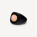 Bague boule en onyx centrée d’un corail cerclé doré.