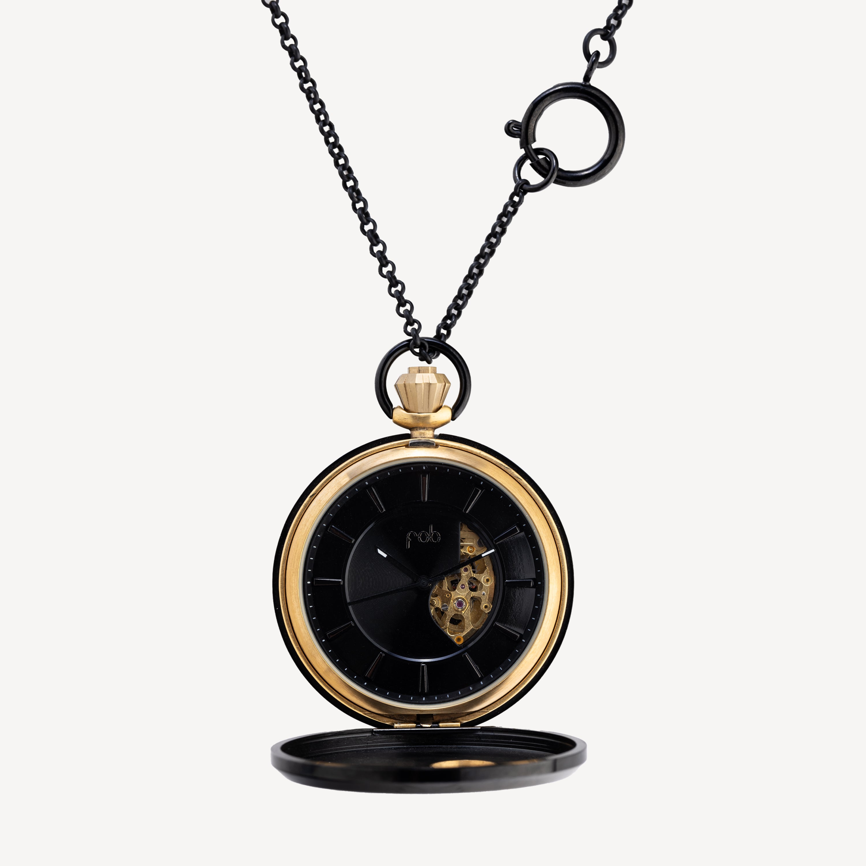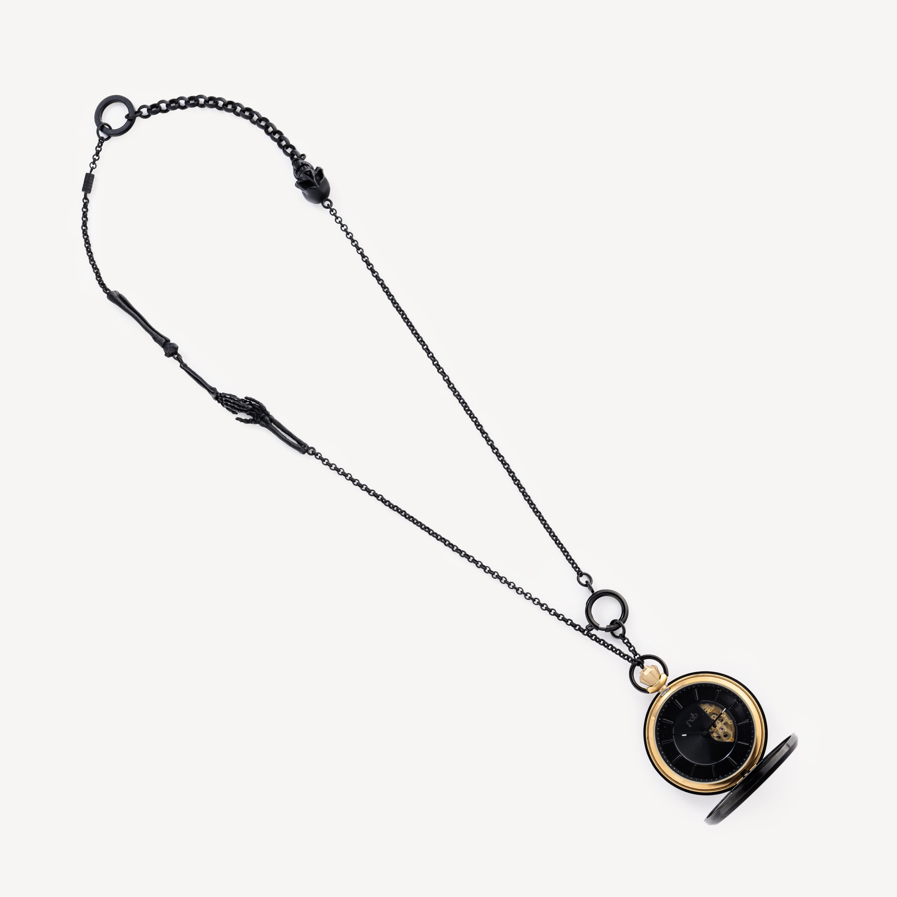 Fob x Bernard Delettrez Taschenuhr, limitierte Auflage 2013. Schwarz mit Totenkopf- und Spinnennetzmotiv. Uhr mit mechanischem Uhrwerk mit automatischem Aufzug, kontinuierlichem Sekundenzeiger. Verkauft mit schwarzer Stahlkette, verziert mit Skelettarmen und Totenkopf.
