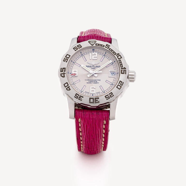 Montre Breitling certifiée chronomètre, 32 mm, calibre quartz. Boîtier acier, bracelet cuir rose (usures visibles). Fonctionne parfaitement. Boîte d’origine fournie (abîmée). Pas de papiers. Bon état de fonctionnement, quelques rayures d’usage sur le boîtier.