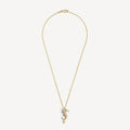 Yellow gold chain with a seahorse pendant in yellow and white gold, decorated with white diamonds, an emerald and a diamond tassel.