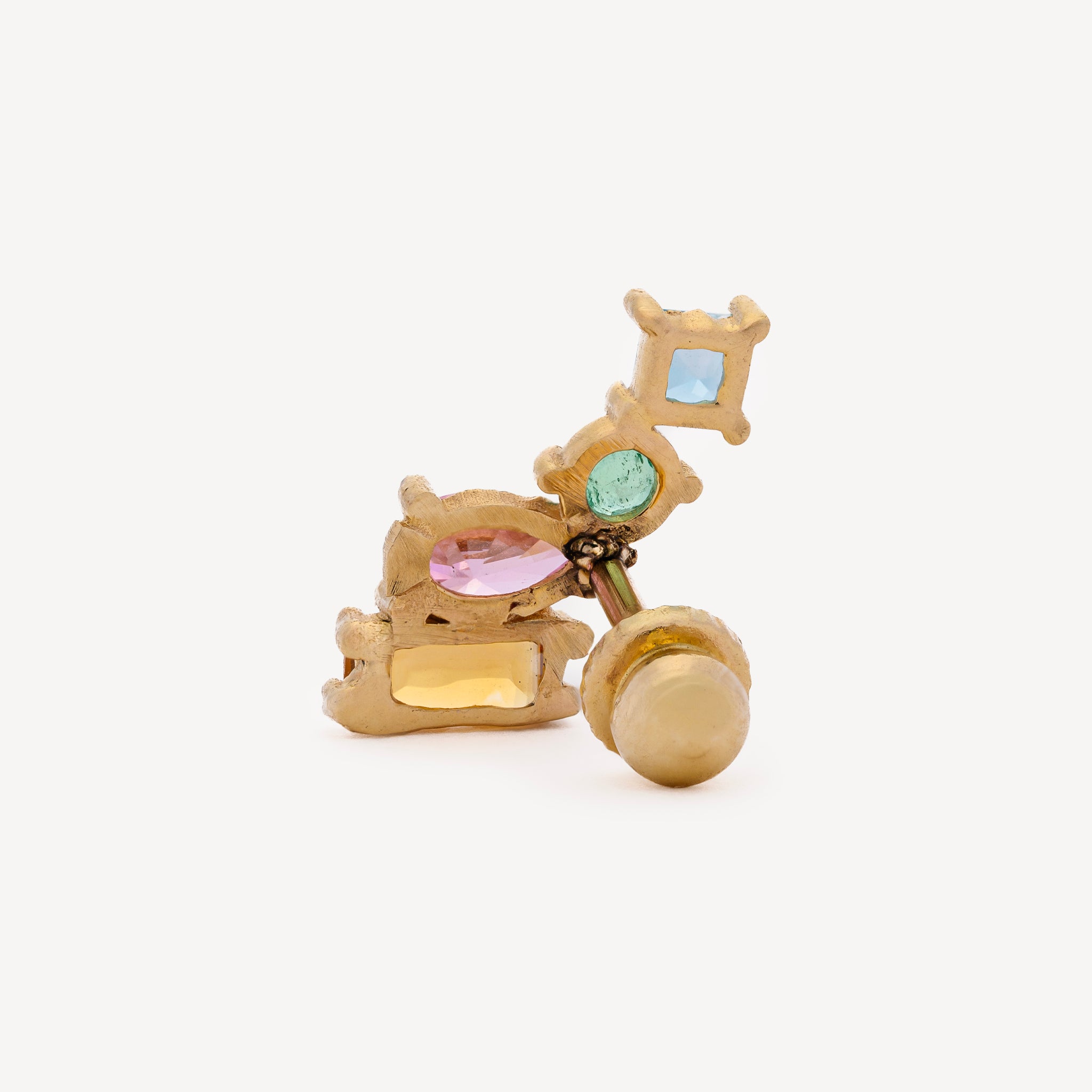 Just Lika révèle le caractère de la boucle d'oreilles Mini Imperial Harmony en or et diamants grâce à ses pierres de quatre couleurs différentes. La citrine élève l’âme, l'émeraude ouvre le cœur et la rhodolite unit l’amour divin.