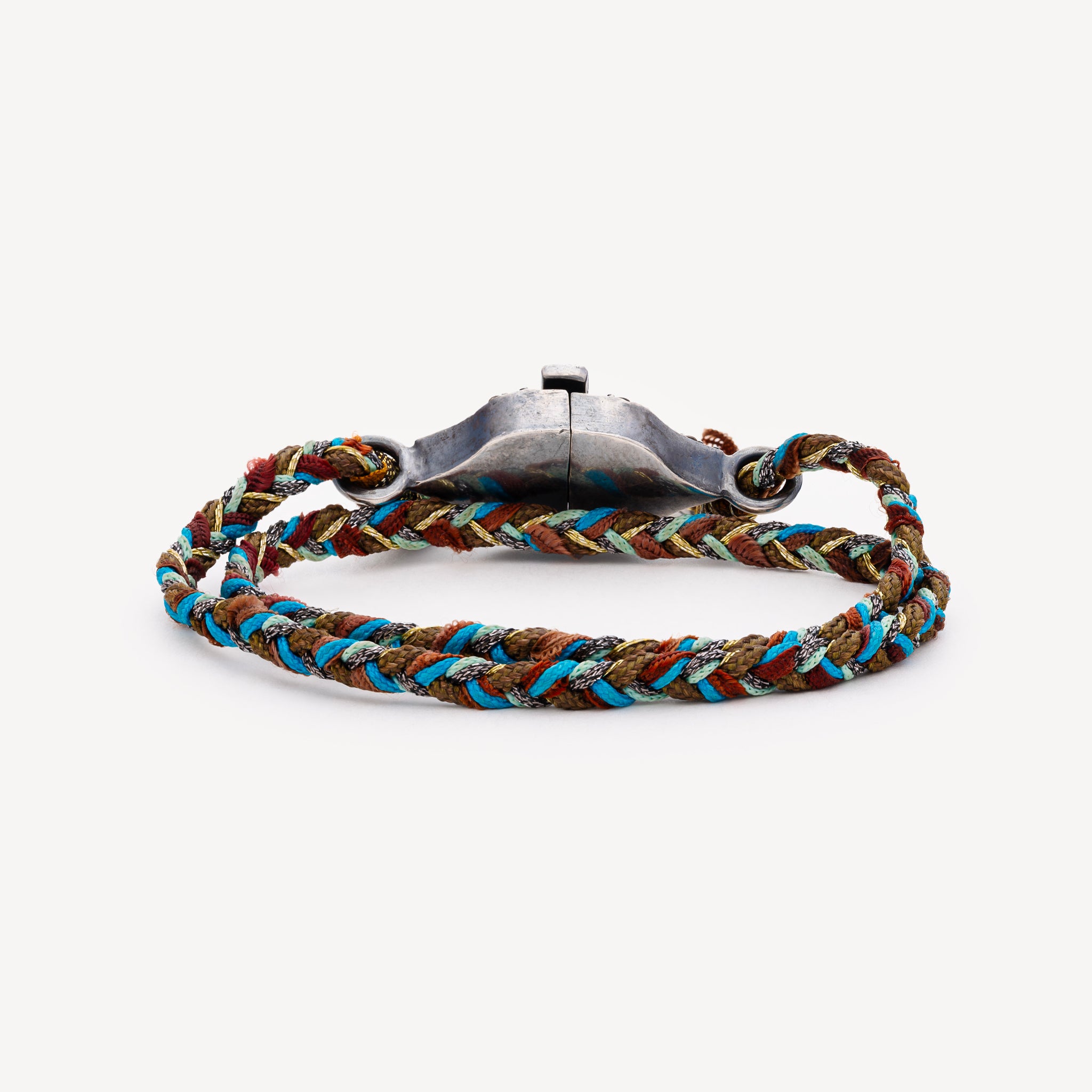 Bracelet double tours composé de cordons bleus, bruns, argentés et dorés et orné d’un fermoir en argent décoré de diamants blancs et d’étoiles en or jaune.