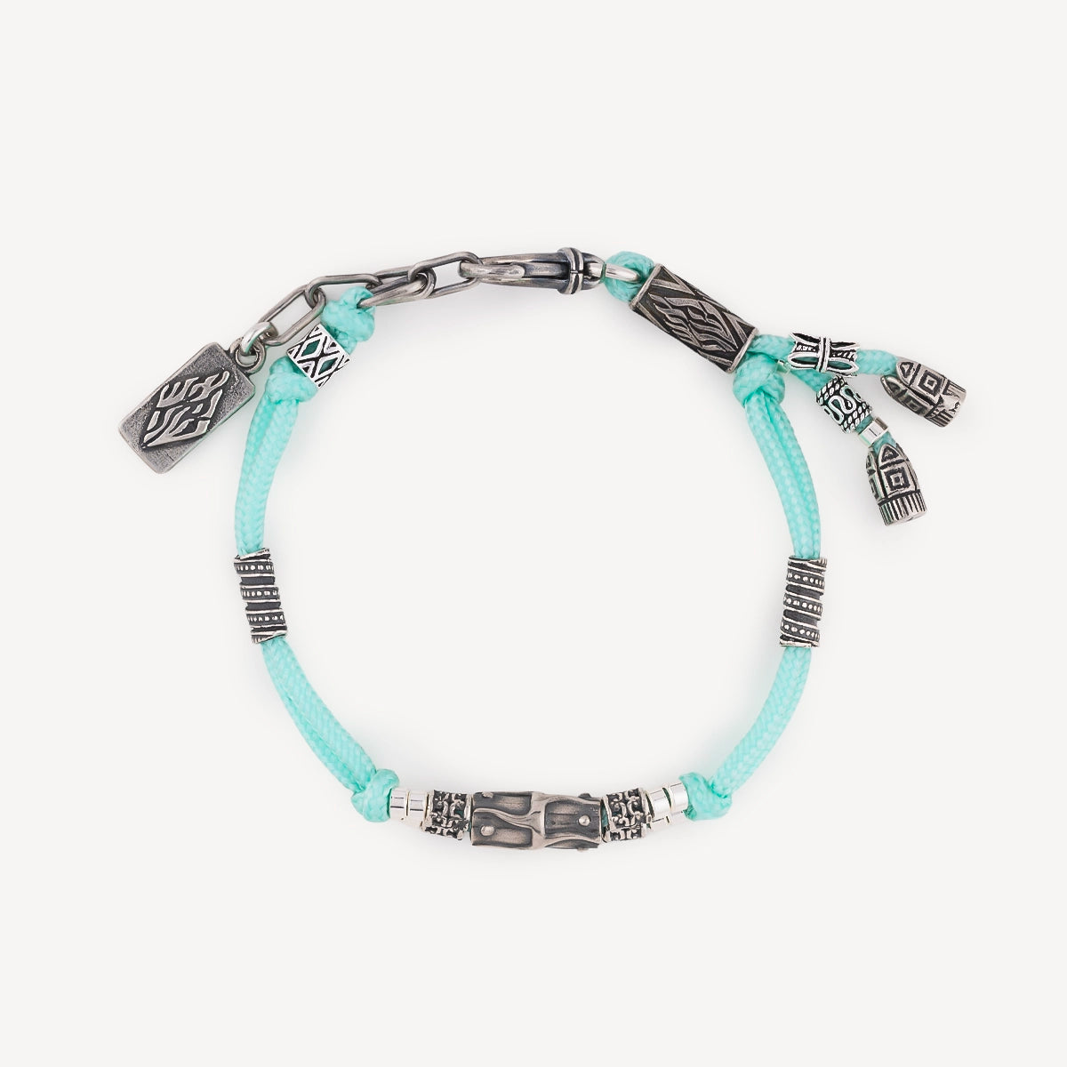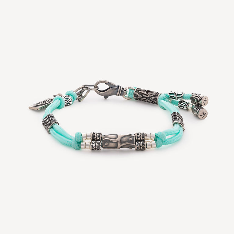 Découvrez le Bracelet Simha de la Maison Kameart. Le cordage vert givré, naturel, s’orne de perles en argent finement travaillées, captant la lumière avec douceur. Porté au poignet, ce bijou évoque un lien précieux, intime et sincère.