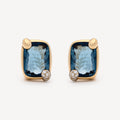 Yellow gold clip-on earrings adorned with a central London blue topaz and a diamond-paved claw.