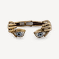 Bronze bangle bracelet with hands holding glass eyes.