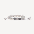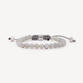 Bracelet mounted on a gray cord composed of 26 beads and a lock: 1 white gold lock set with a white diamond, 22 moonstone beads, 3 white gold beads set with white diamonds as well as a white gold bead paved with white diamonds.
