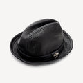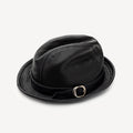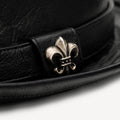 Black leather hat with silver buckle and silver fleur-de-lis coin.
