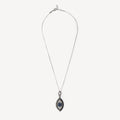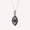 Silver chain with black gold evil eye pendant adorned with black and white diamonds and sapphires.