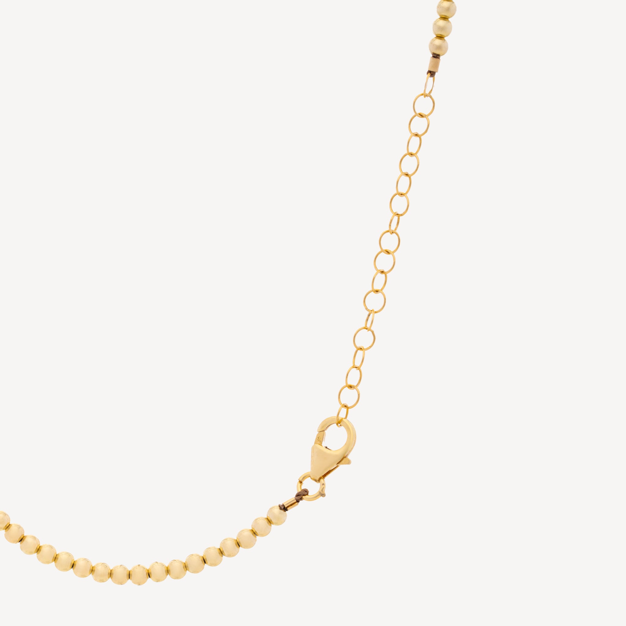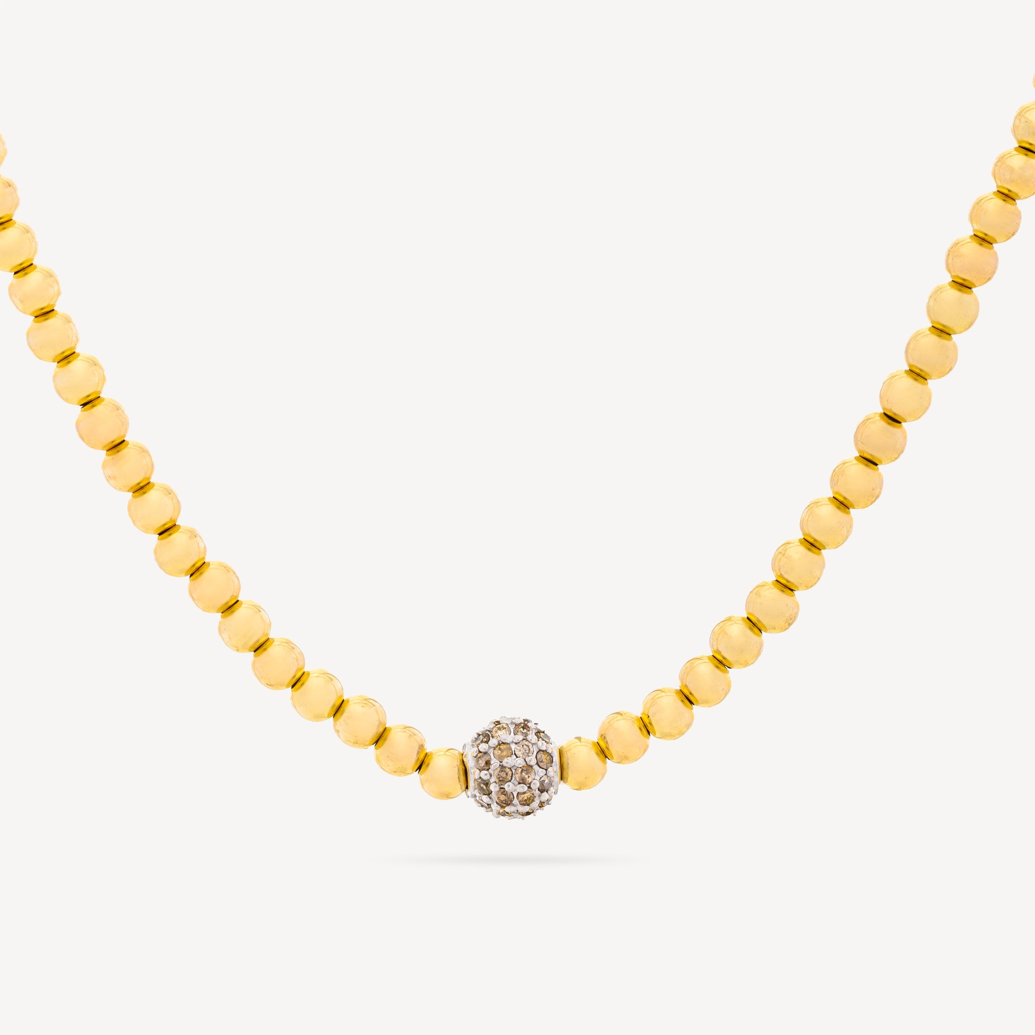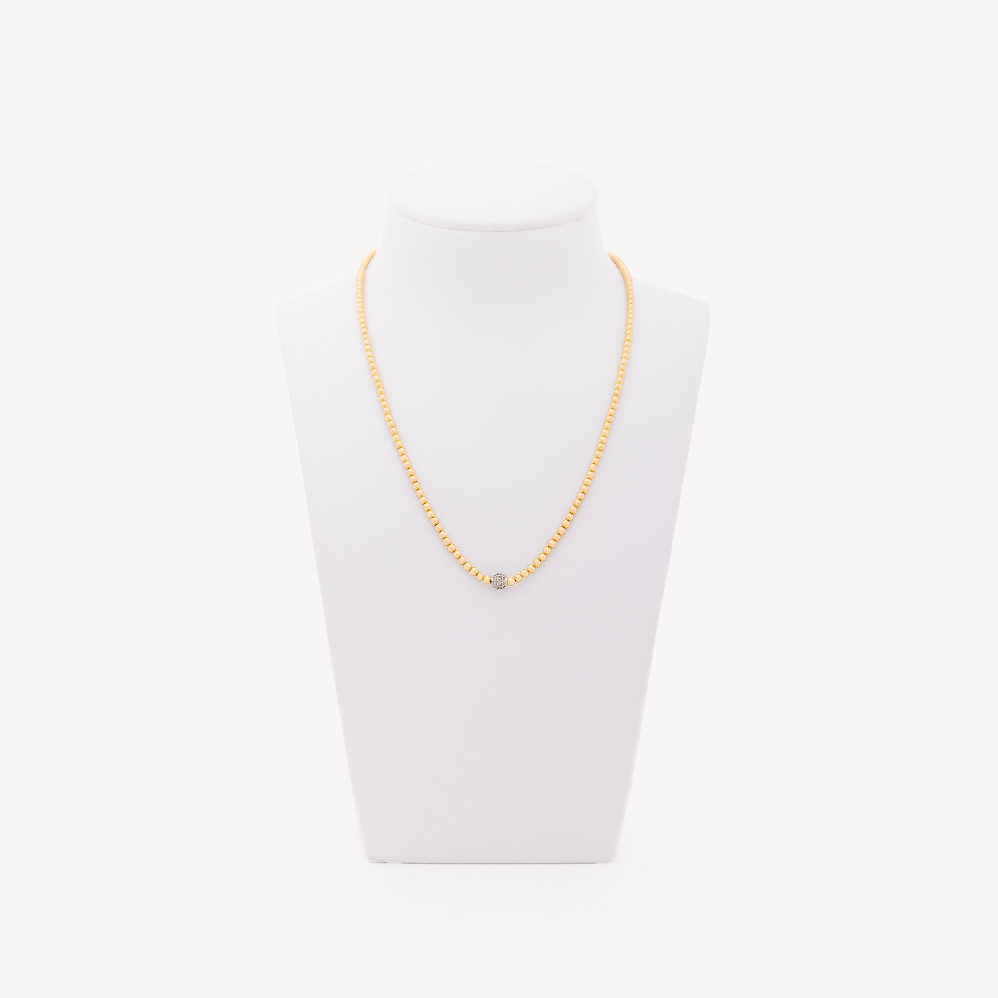 Ce collier en or jaune de Diane M est composé de perles élégantes, avec une perle centrale en or blanc pavée de diamants blancs scintillants. Symbole d’éternité et de lumière, le diamant élève les énergies, renforce la clarté mentale, la force intérieure et apporte équilibre et pureté à celui ou celle qui le porte.