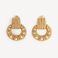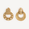 Vintage clip-on earrings in gold-plated metal with a dangling circle adorned with faux white pearls.