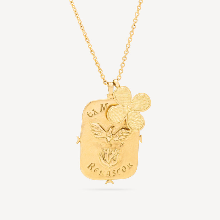 Enjoy the elegance and beauty of the Phoenix Shirin Yellow Gold Necklace. Crafted in 18ct yellow gold, this necklace features the Phoenix and Shirin pendants, symbols of rebirth, purity, and grace.