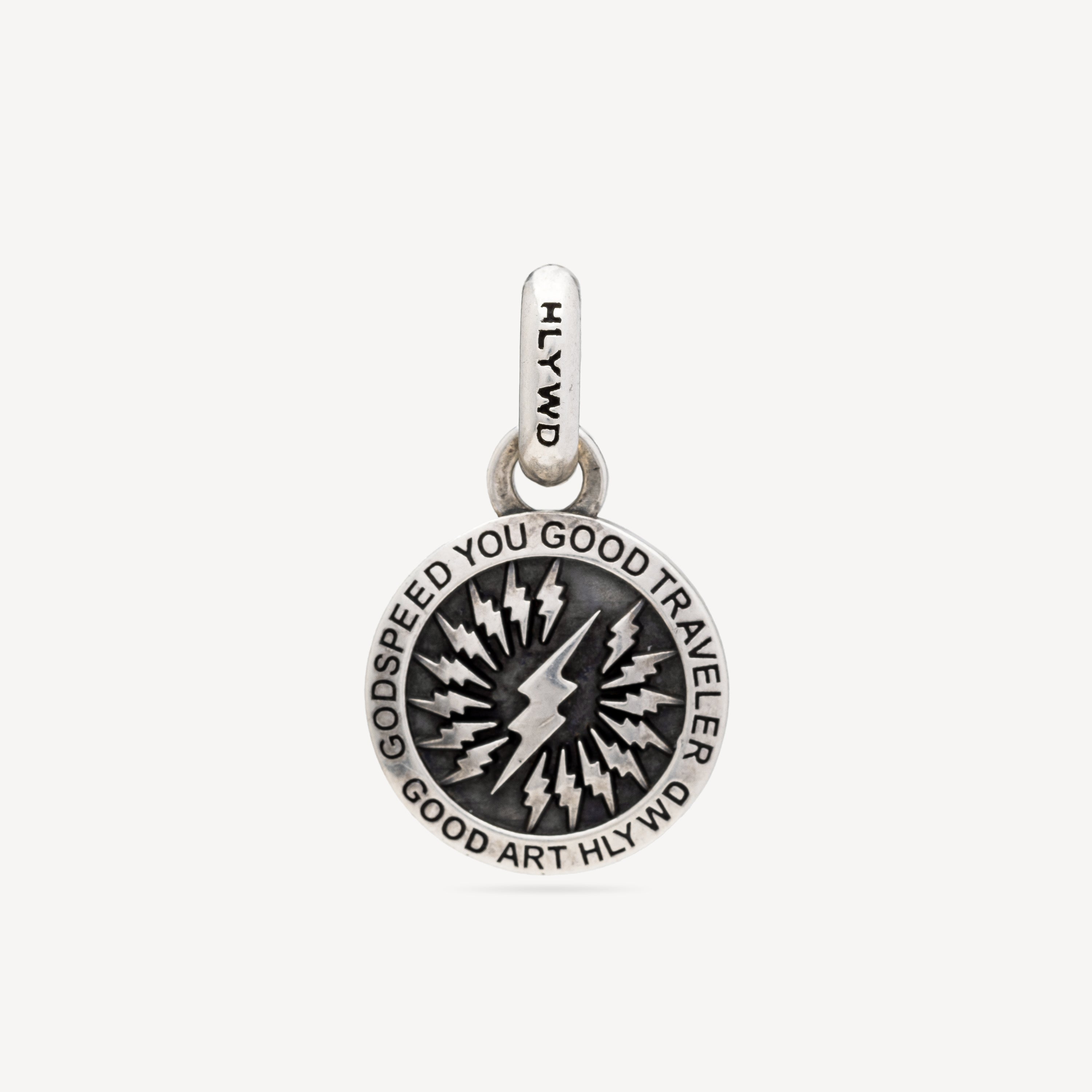 Silver pendant with Saint Christopher on the front and lightning bolt on the back.