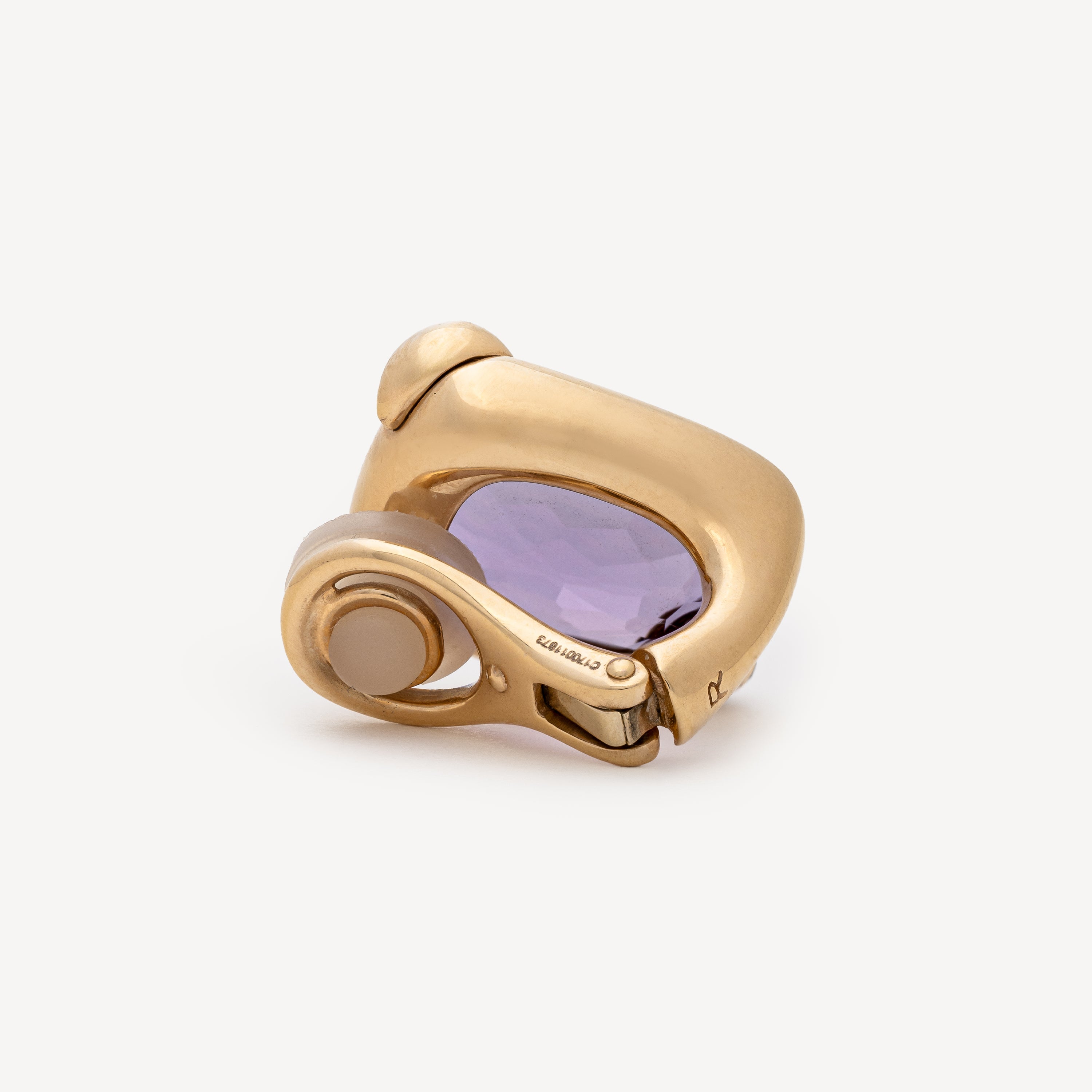 Clip-on earrings adorned with a central amethyst and a claw paved with white diamonds.