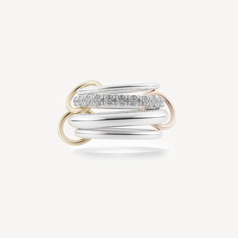 The Janssen ring consists of four bands of varying sizes set with pavé diamonds, connected by movable 18ct gold connectors.