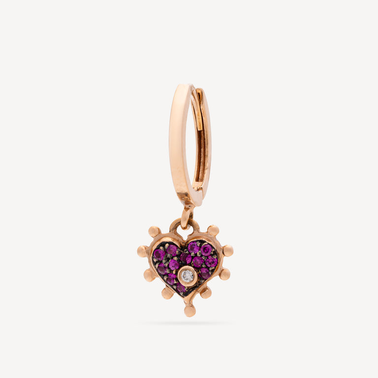 Crafted in high-quality rose gold, this Selda earring features a delicate heart adorned with pink sapphires and a dazzling diamond.