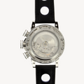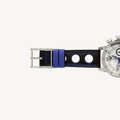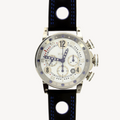 Valjoux 7753 automatic chronograph movement, diameter 44mm. Polished stainless steel case, 12 blue sapphires on flange. White lacquered gray stainless steel crown and pushers. Gray stainless steel horns. Glass above below (back and bezel) sapphire. White dial with gray appliques. Lightened super light dark blue hands. Superfine stainless steel screws. Black leather strap with holes, dark blue double stitching. Water resistance 100m.