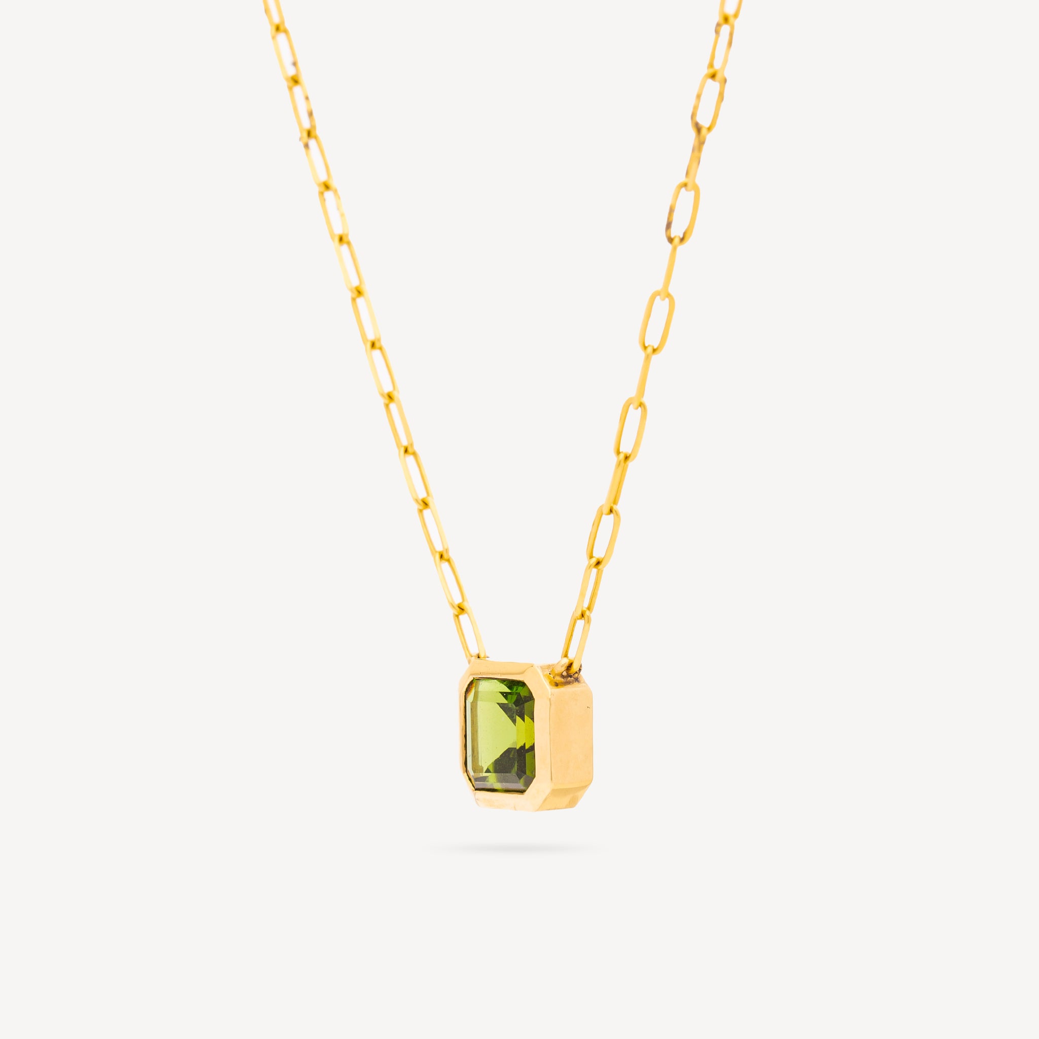 Associé à une chaîne géométrique en or jaune 18 carats, ce collier impose sa présence avec subtilité mais assurance. Son pendentif met en valeur une tourmaline taillée en Allemagne selon la technique « german-cut », fruit du savoir-faire de lapidaires d’exception. Pierre de transformation, la tourmaline aide à équilibrer les émotions, dissiper les énergies négatives et favoriser l’ancrage.