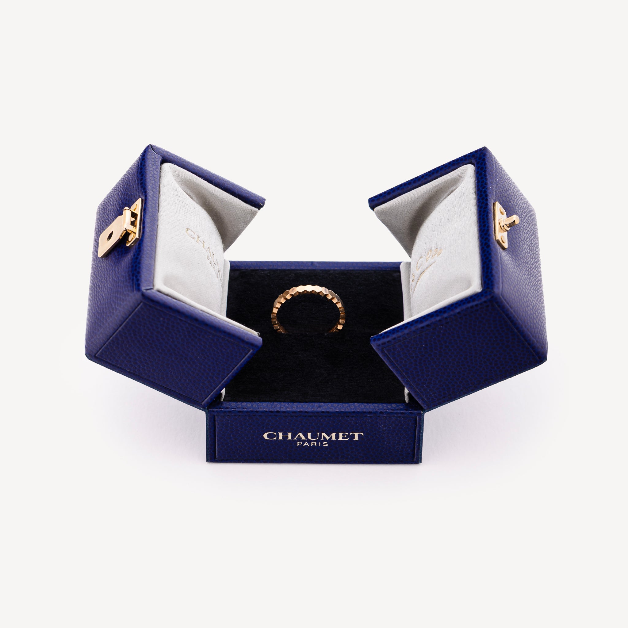 Bague Bee de Chaumet en or rose. Réinterpréter le motif de l’abeille. Symboliser la nature vibrante et vivante. Encapsuler la lumière. Unique en son genre, la collection Bee de Chaumet résulte de la fusion de ces composantes. Des créations graphiques et aspirationnelles où les alvéoles, unies les unes aux autres, se succèdent à l’infini. Et diffusent leur lumière à nulle autre pareille, faisant rayonner celles et ceux qui les portent, ensemble.
