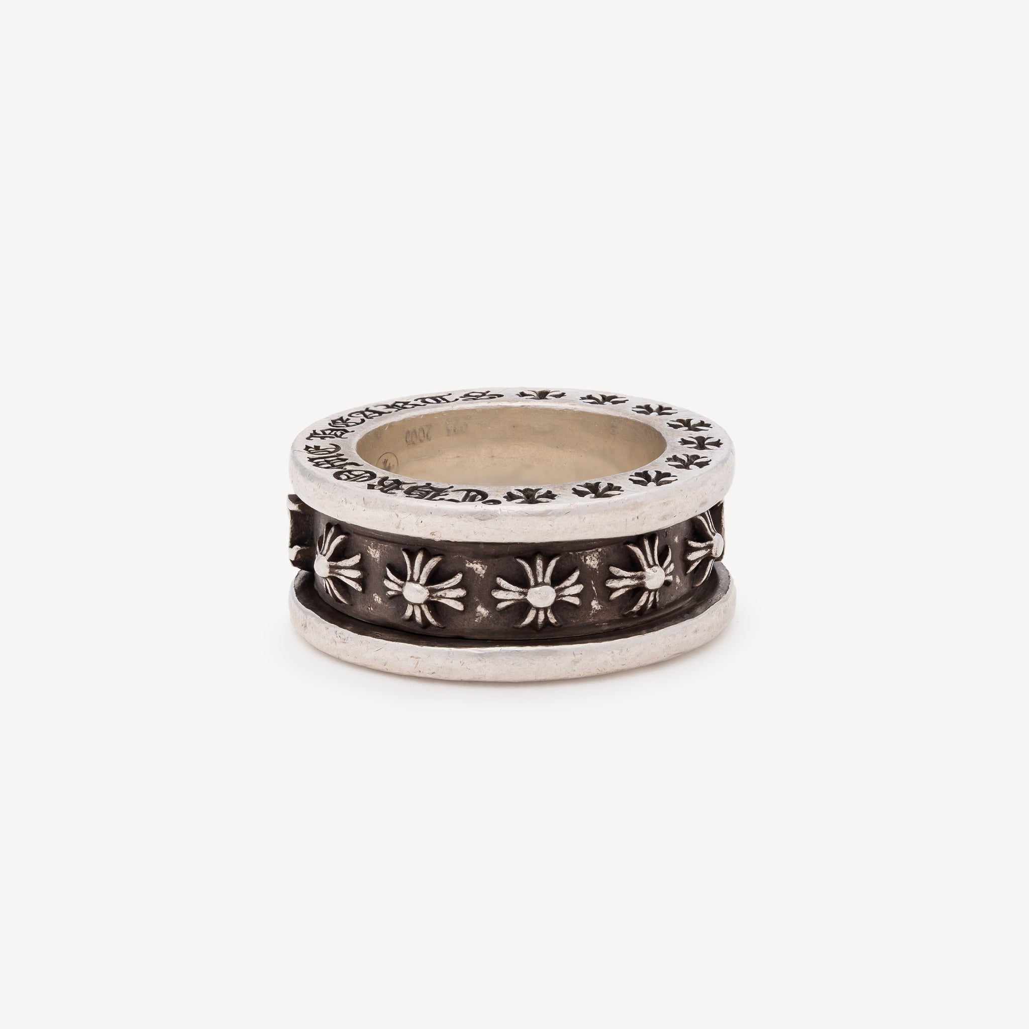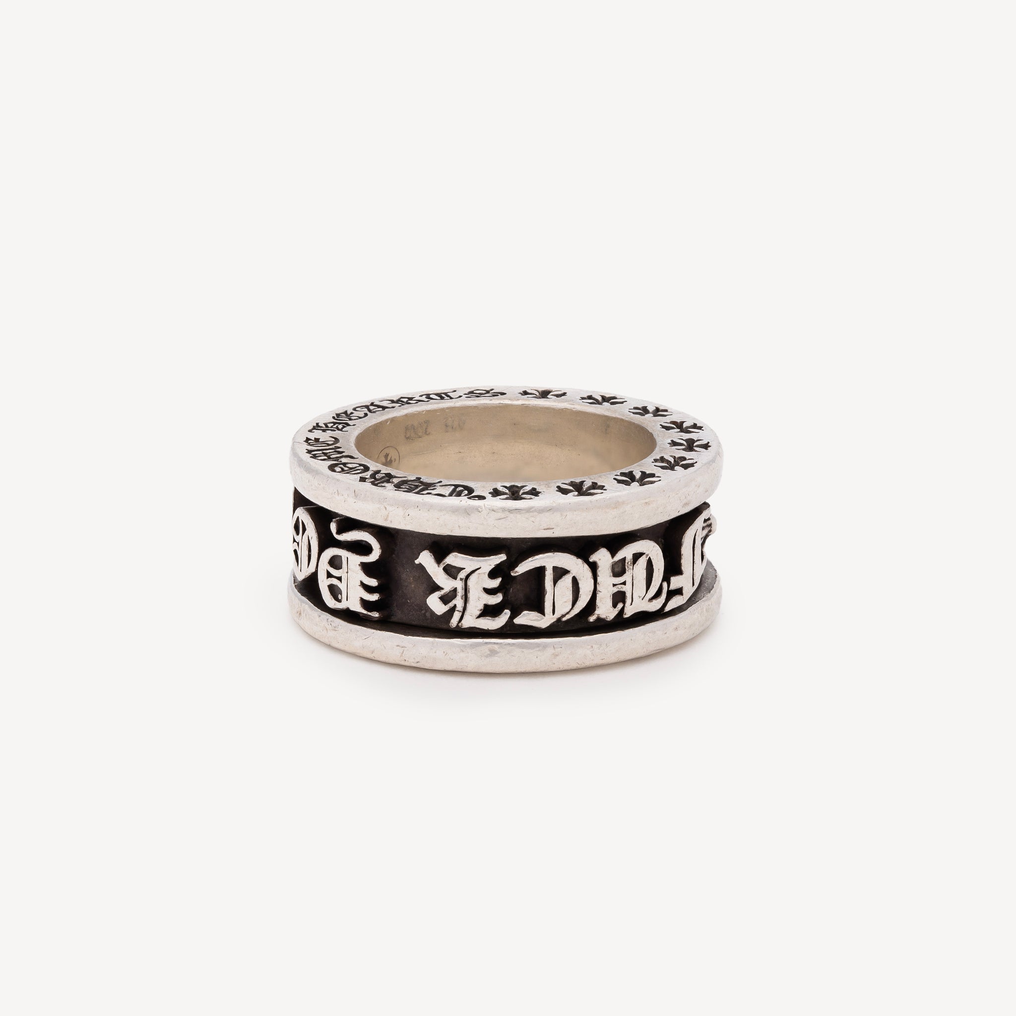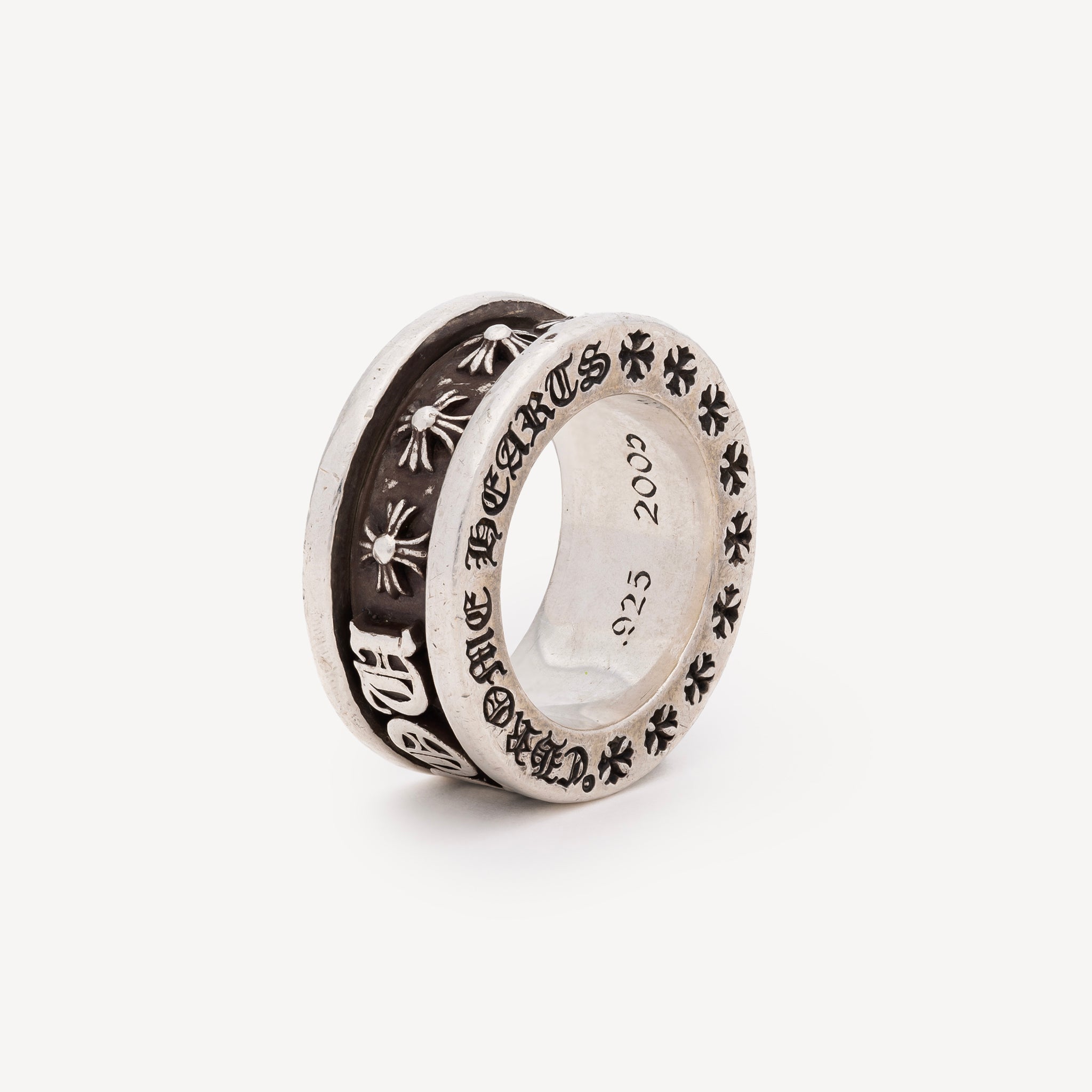 Bague en argent avec pièce roulante au centre. La bague est ornée de croix Chrome Hearts et de l’inscription “FUCK YOU”.