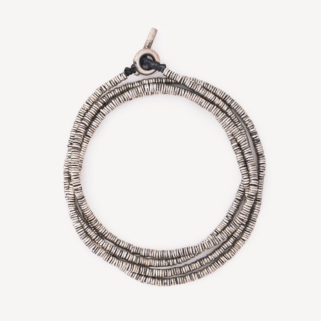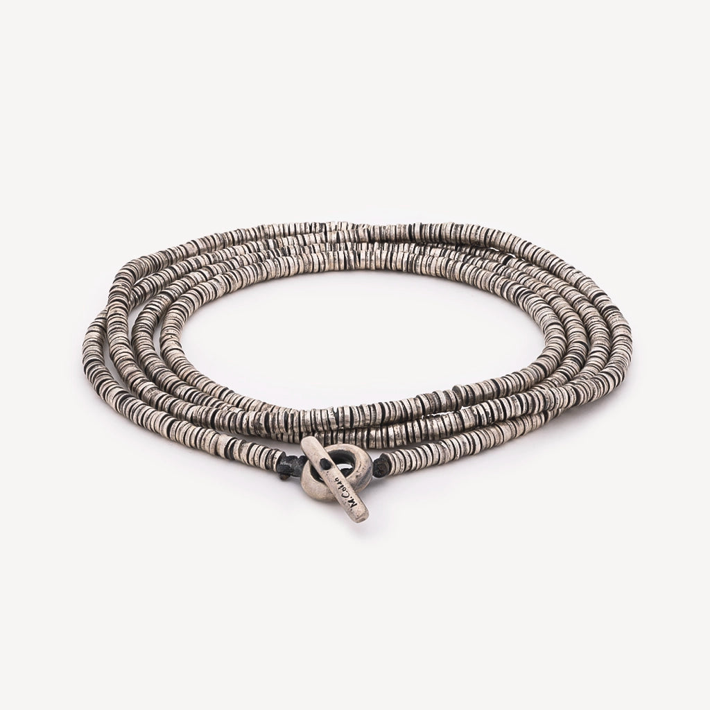 Bracelet quatre tours signé M Cohen orné de disques en argent vieilli avec un fermoir en T. Peut également se porter en sautoir.