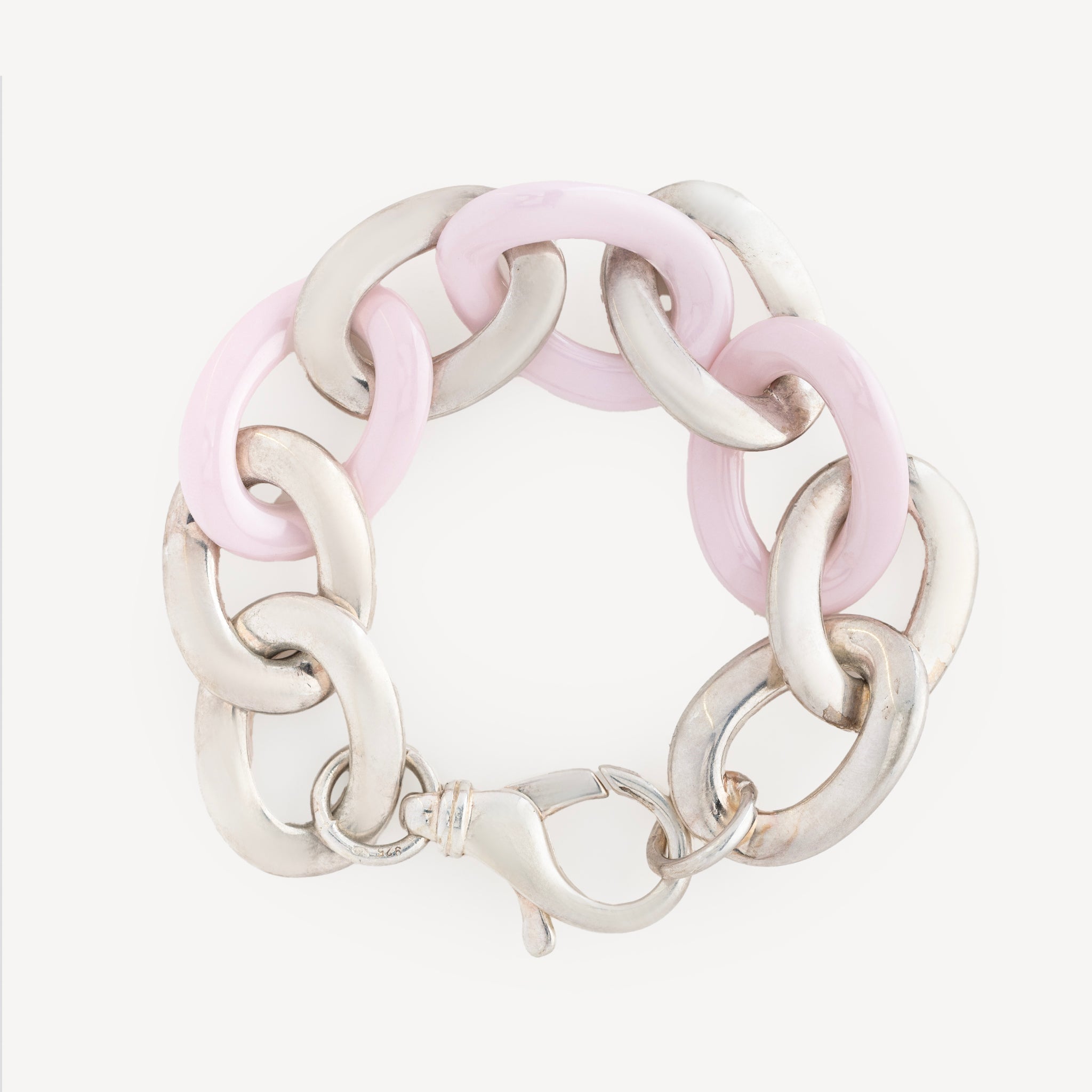 Bracelet chaîne en argent avec 3 maillons en céramique rose.