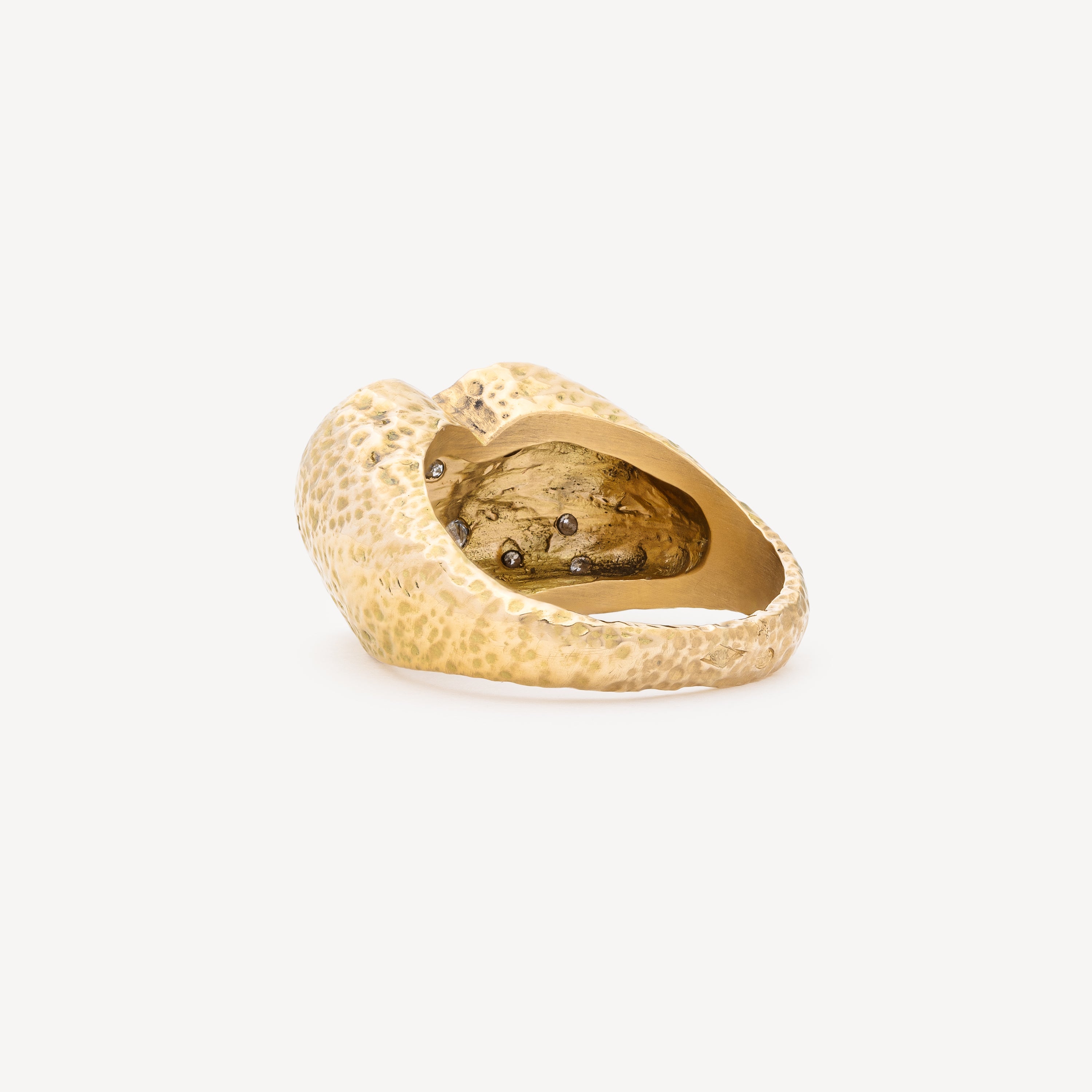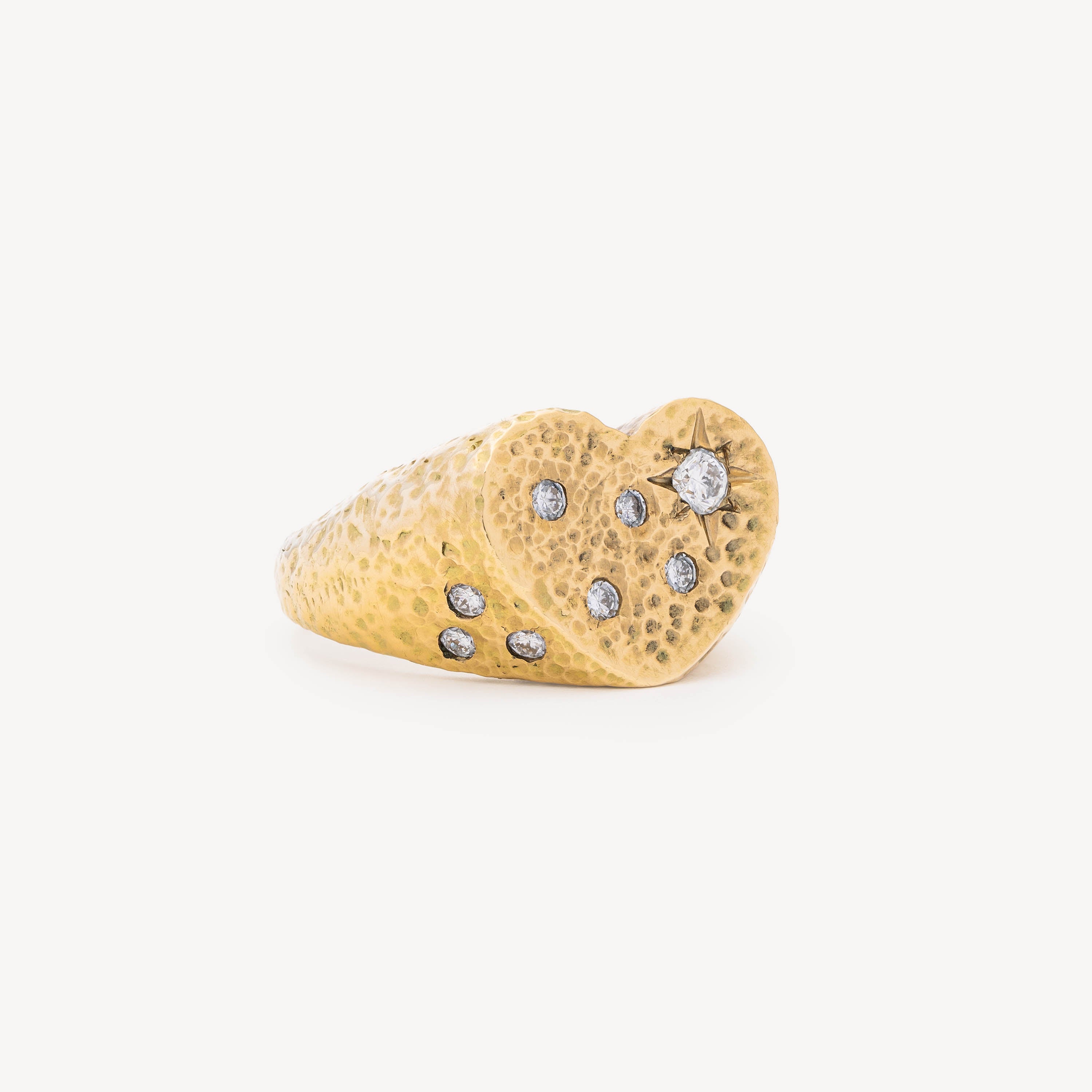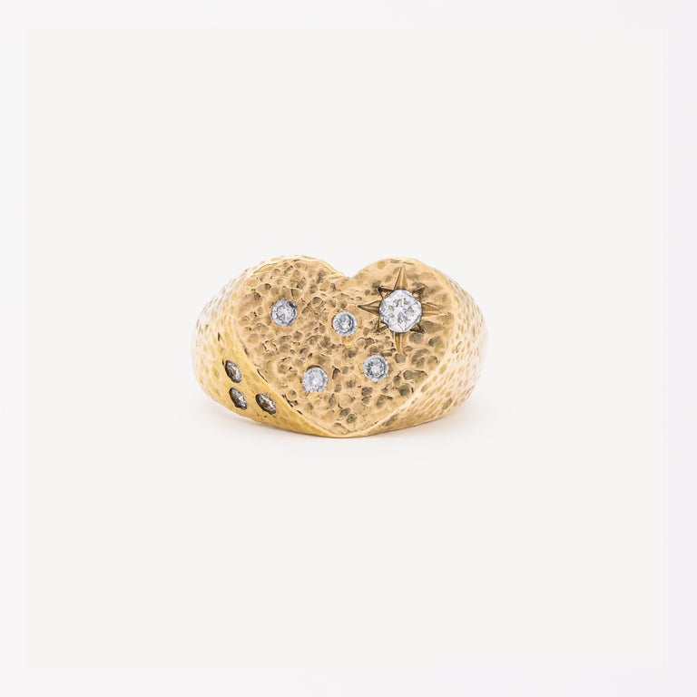 The Sim Etoile ring is heart-shaped in yellow gold, adorned with diamonds for an elegant and refined look. The milled design adds a touch of sophistication to this timeless ring.