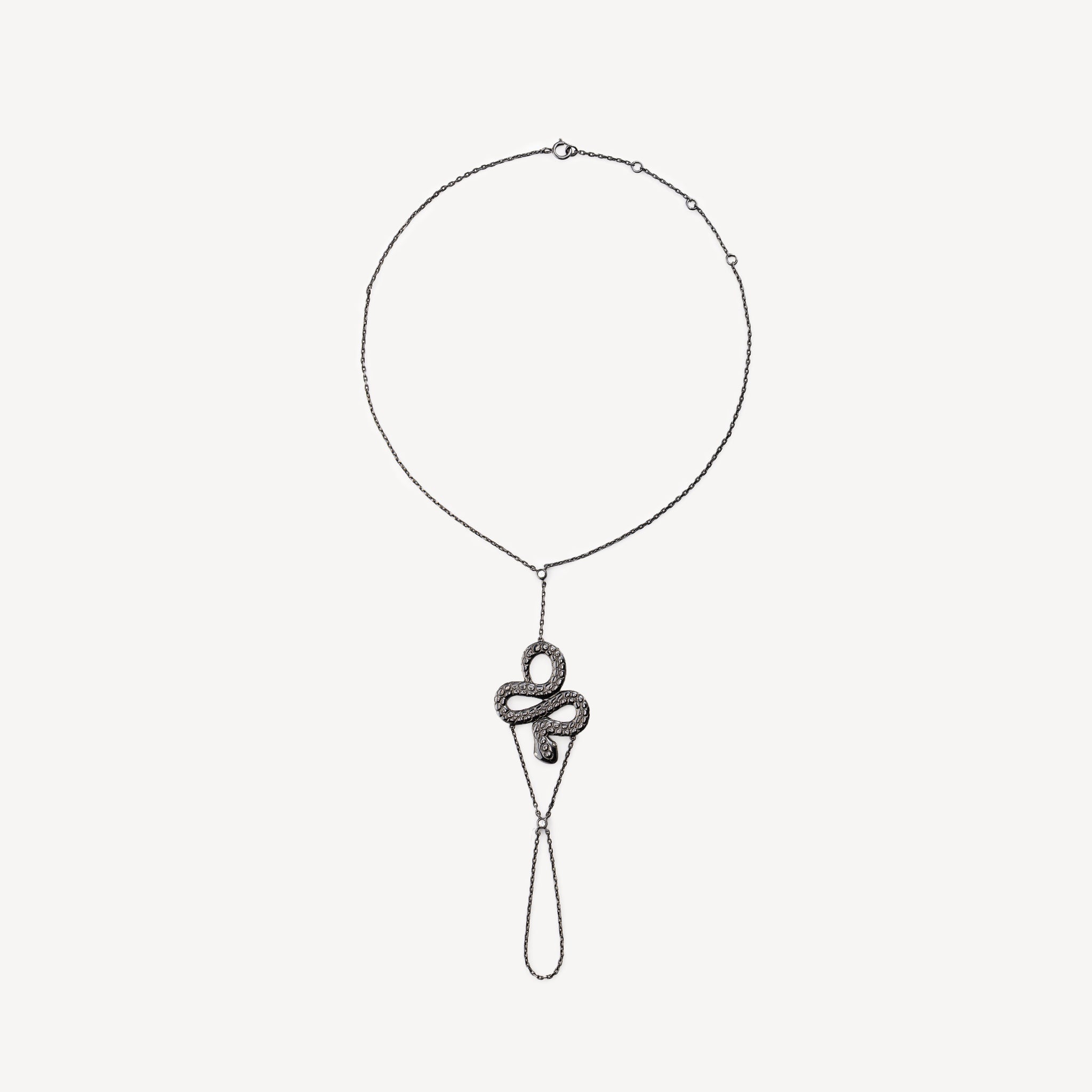 Bracelet de cheville en argent noirci avec motif serpent et petits diamants blancs. Chaîne à taille réglable.