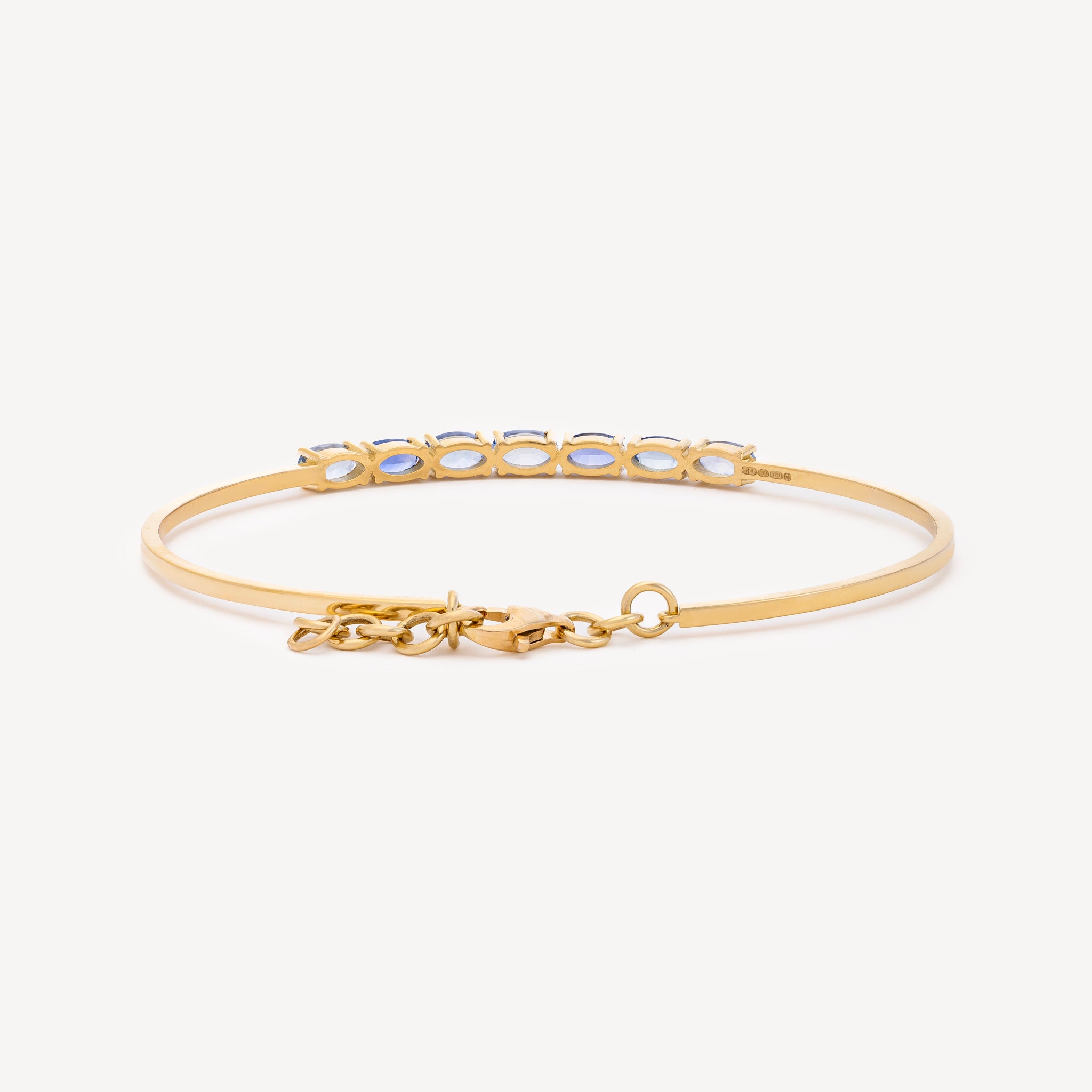 Le bracelet Dumom dispose de sept saphirs bleus montés sur de l'or jaune 18 carats rigide. Le saphir bleu est symbole de sagesse et d’apaisement.