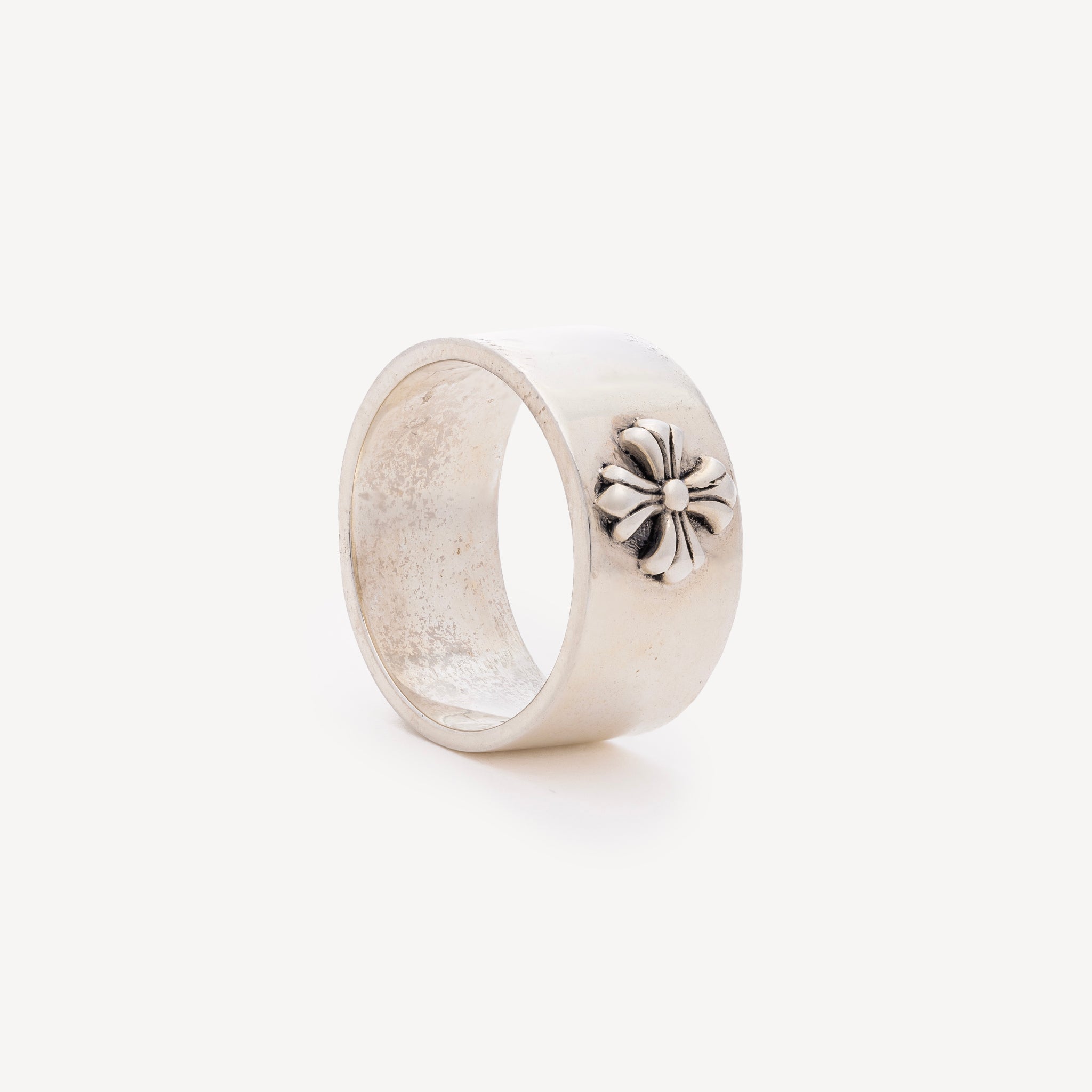 La bague Floral Chopper Iron Cross Band en argent présente un large anneau sur lequel se tient une fleur de Lys centrale.