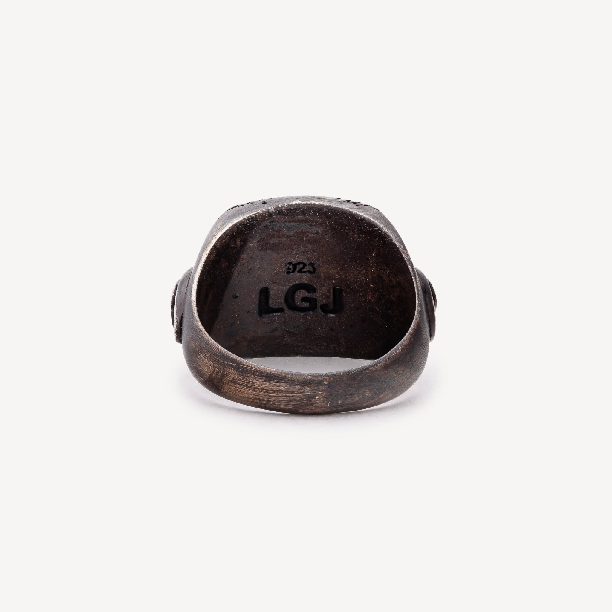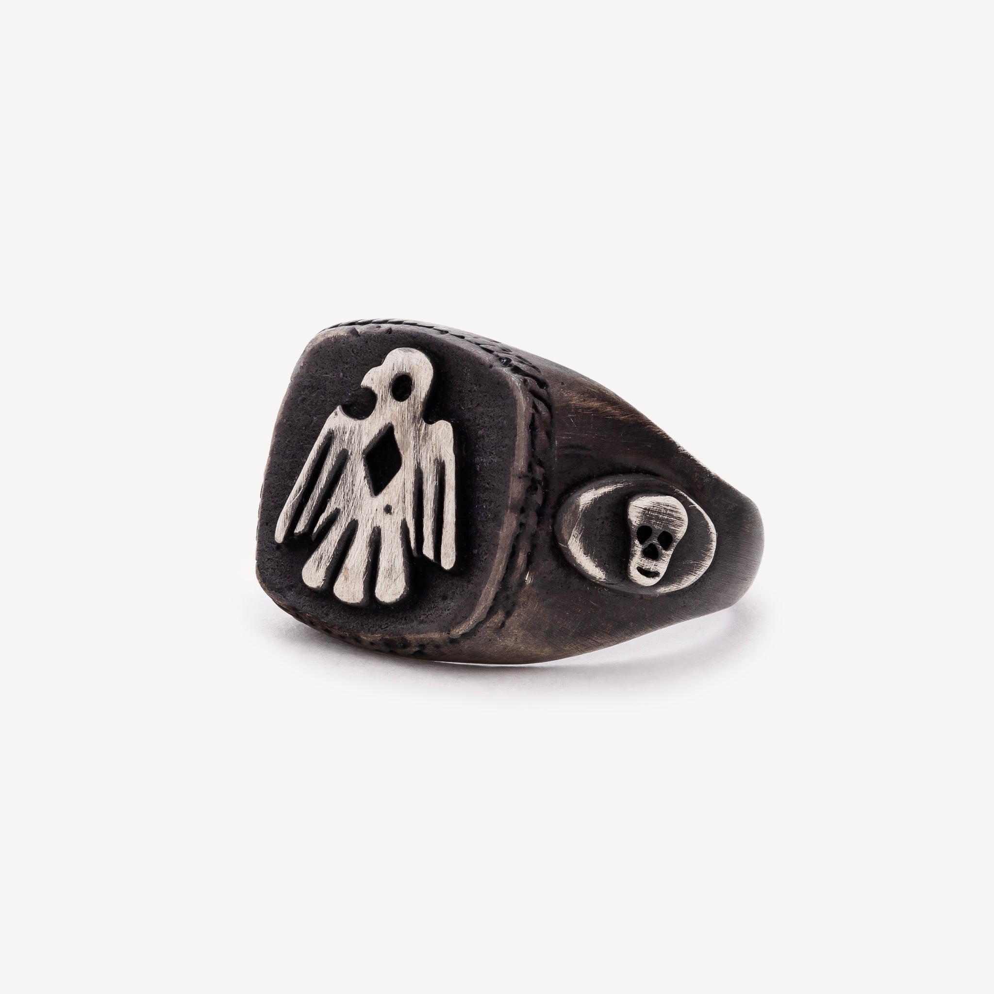 La bague Thunderbird en argent oxydé est ornée d'un aigle gravé au centre de la bague ainsi que deux têtes de mort de chaque côté symbolisant la liberté.