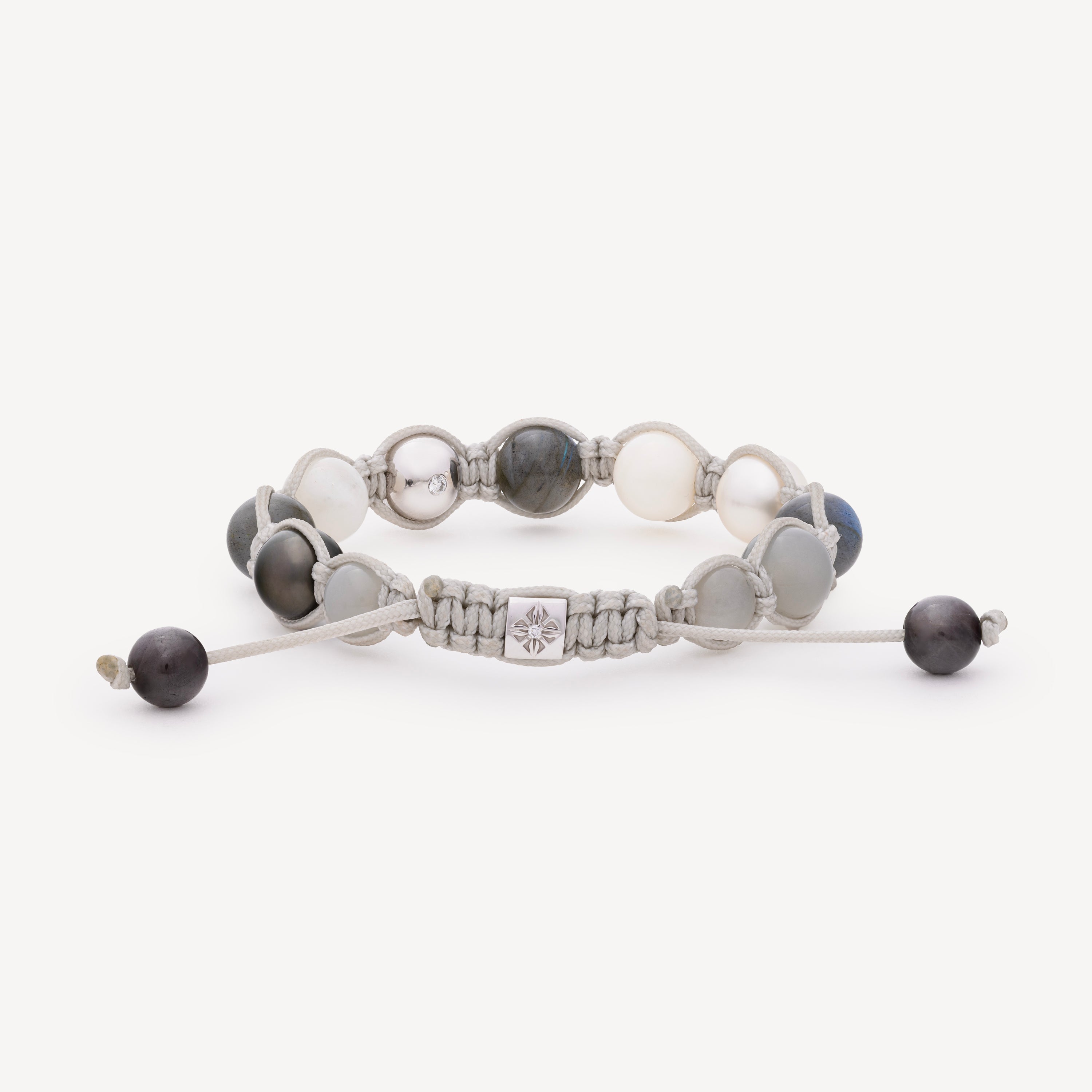 Bracelet mounted on a gray cord composed of: a white gold bead set with white diamonds, a white gold lock set with a white diamond, a moonstone bead, a Tahitian pearl bead, a pearl bead, three gray labradorite beads, a rainbow moonstone bead, a white coral bead, two 8mm gray sapphire beads and two 8mm gray moonstone beads.