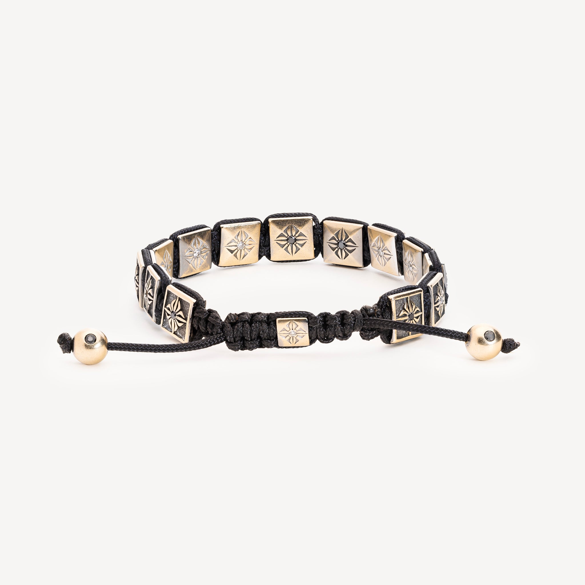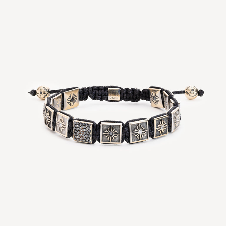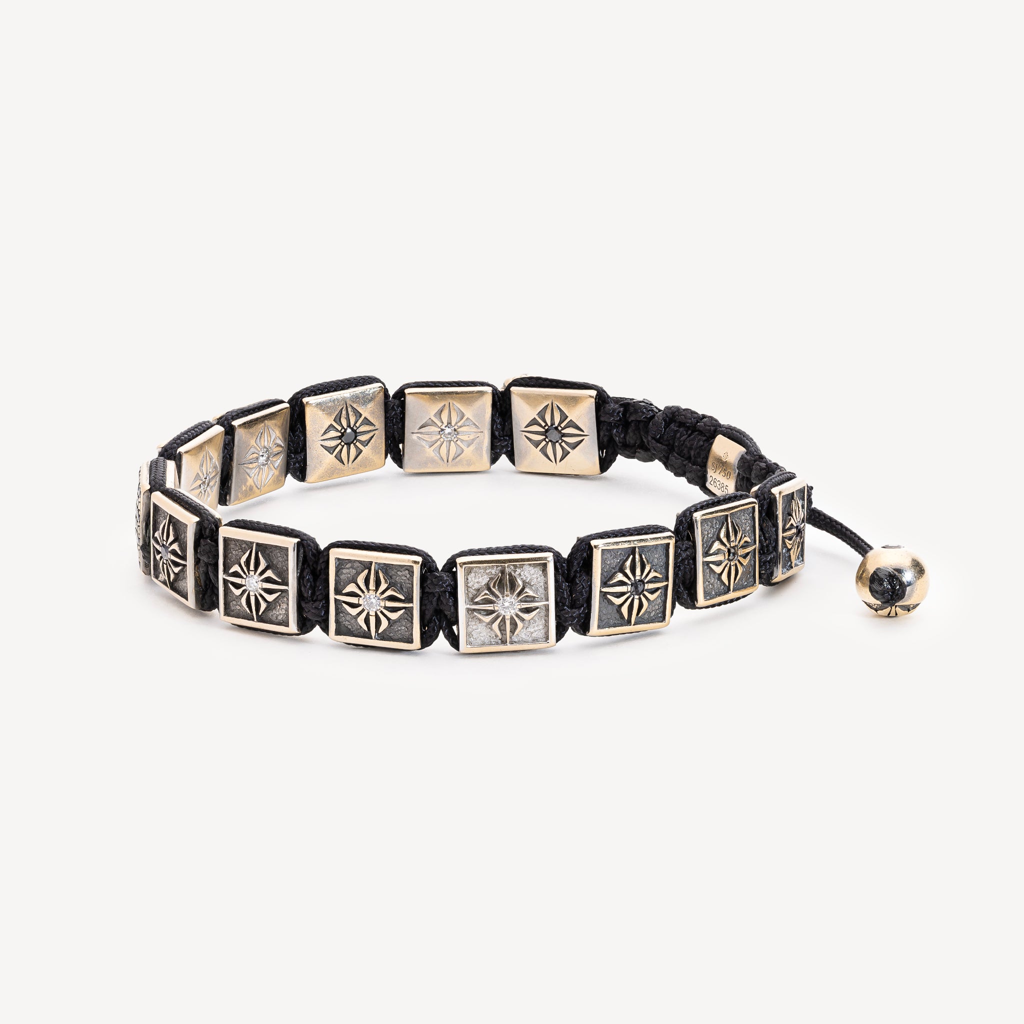 Bracelet monté sur un cordon noir composé de : 1 lock en or noir pavé de diamants noirs, 2 beads en or noir ornées de diamants noirs, 4 locks en or noir ornés de diamants blancs, 6 locks en or noir ornés de diamants noirs, 2 locks en or blanc ornés de diamants blancs, 1 fermoir lock en or noir orné d’un diamant blanc.