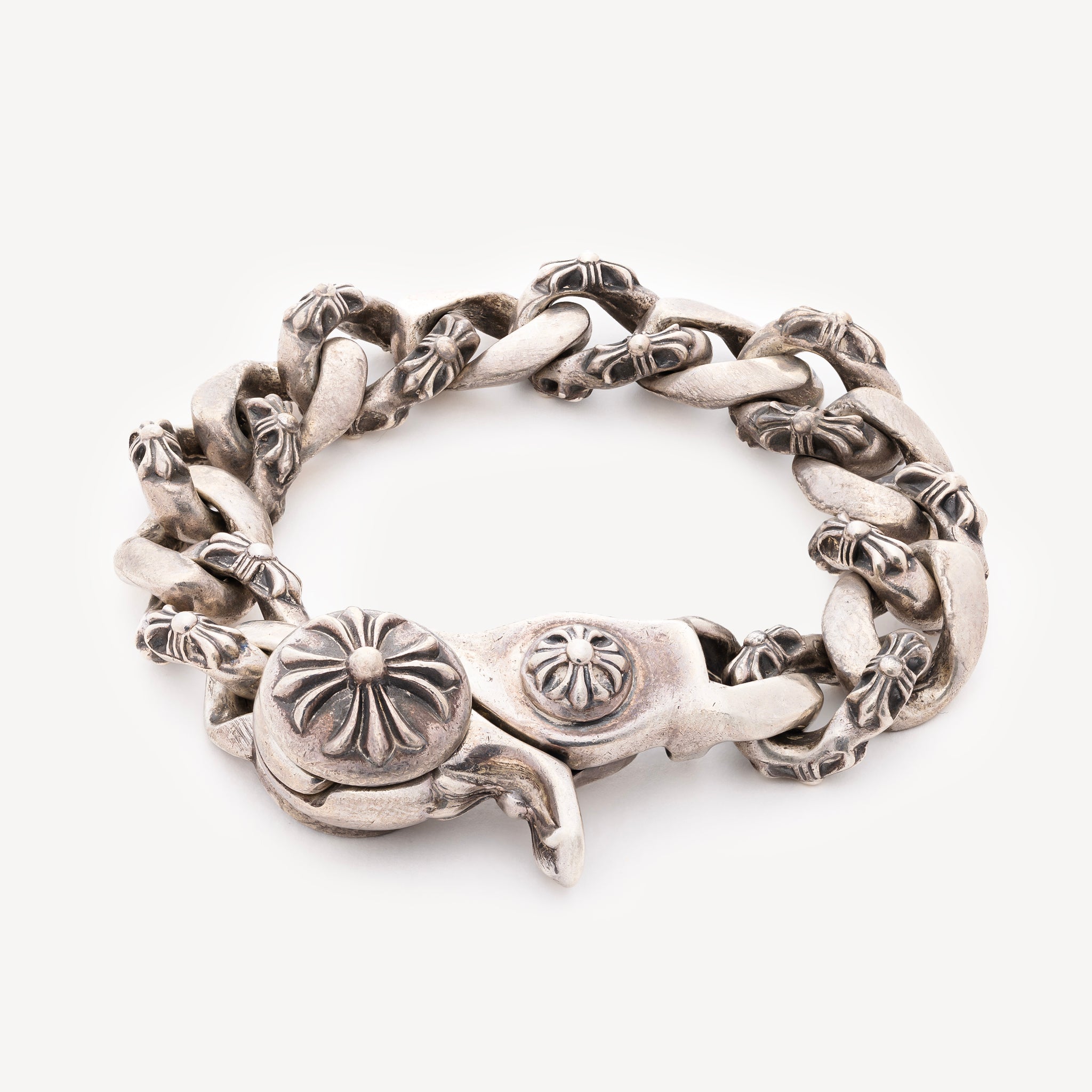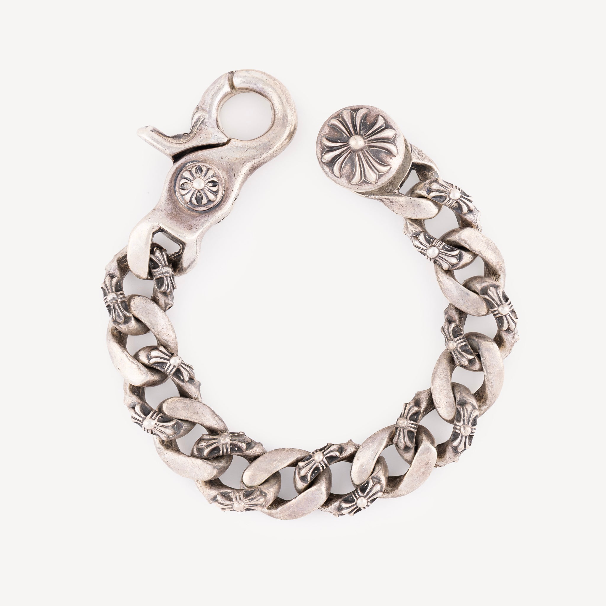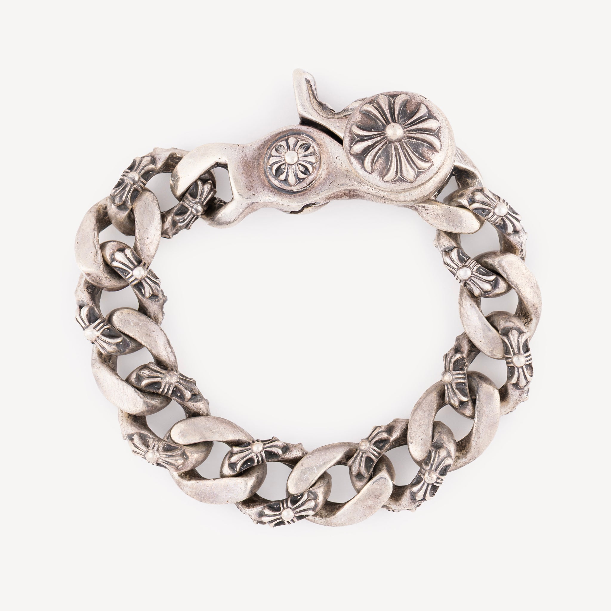 Bracelet chaîne en argent avec fermoir crochet orné de la croix Chrome Hearts et maillons alternés avec croix.