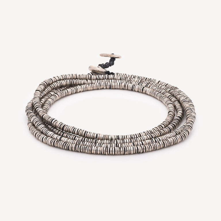 Bracelet quatre tours signé M Cohen orné de disques en argent vieilli avec un fermoir en T. Peut également se porter en sautoir.