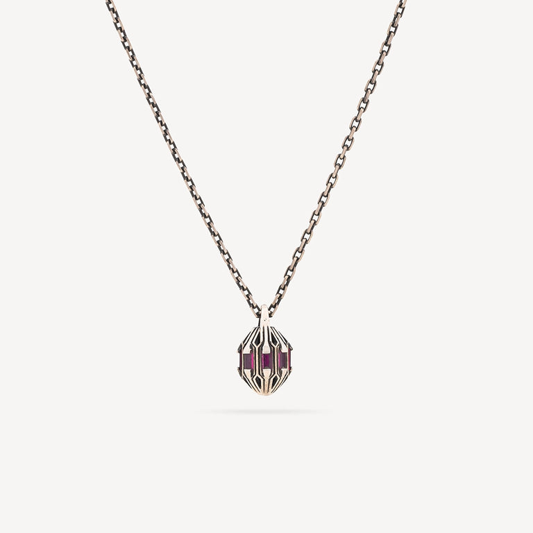 Ce collier en argent Mosaïs révèle un pendentif en forme de boule géométrique, délicatement serti de rubis aux reflets ardents. Symbole de vitalité, de passion et de force intérieure, le rubis insuffle à la pièce une énergie vibrante, contrastant avec la pureté minérale du métal. Les lignes architecturales du pendentif captent la lumière sous chaque angle, tandis que l’argent, vivant et évolutif, se patine avec le temps pour créer une signature unique.