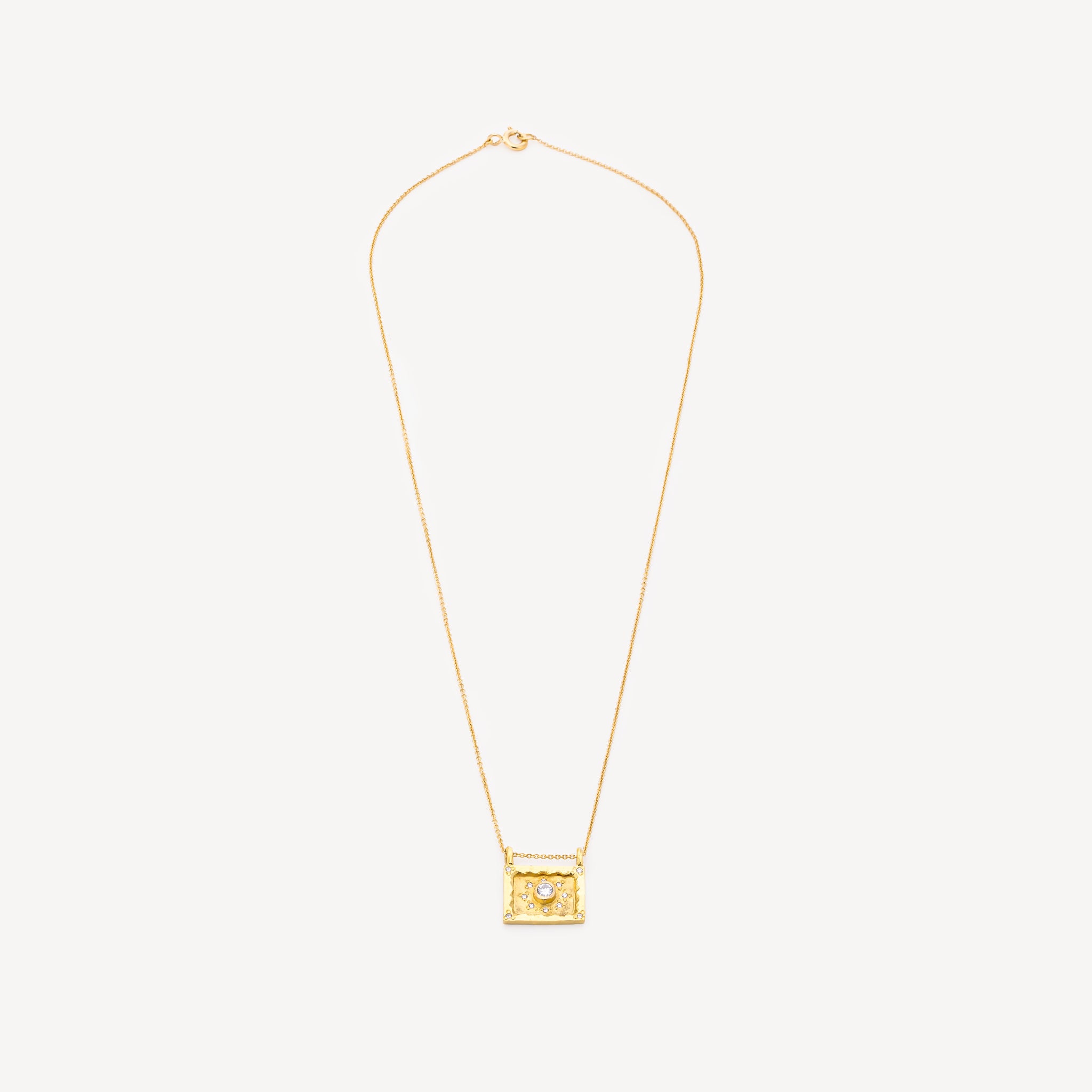 Collier en or jaune 18ct avec pendentif rectangulaire orné d’un diamant blanc central délicatement entouré de 8 petits diamants et d’un diamant à chaque angle. Le diamant blanc symbolise la pureté absolue, il éclaire l’esprit, renforce la clarté intérieure et apporte équilibre et harmonie émotionnelle.