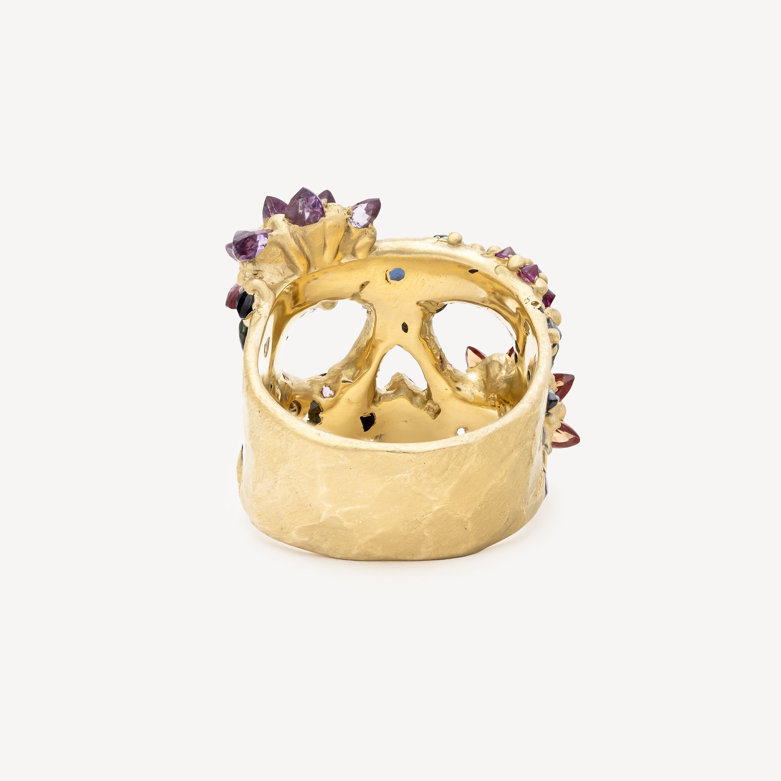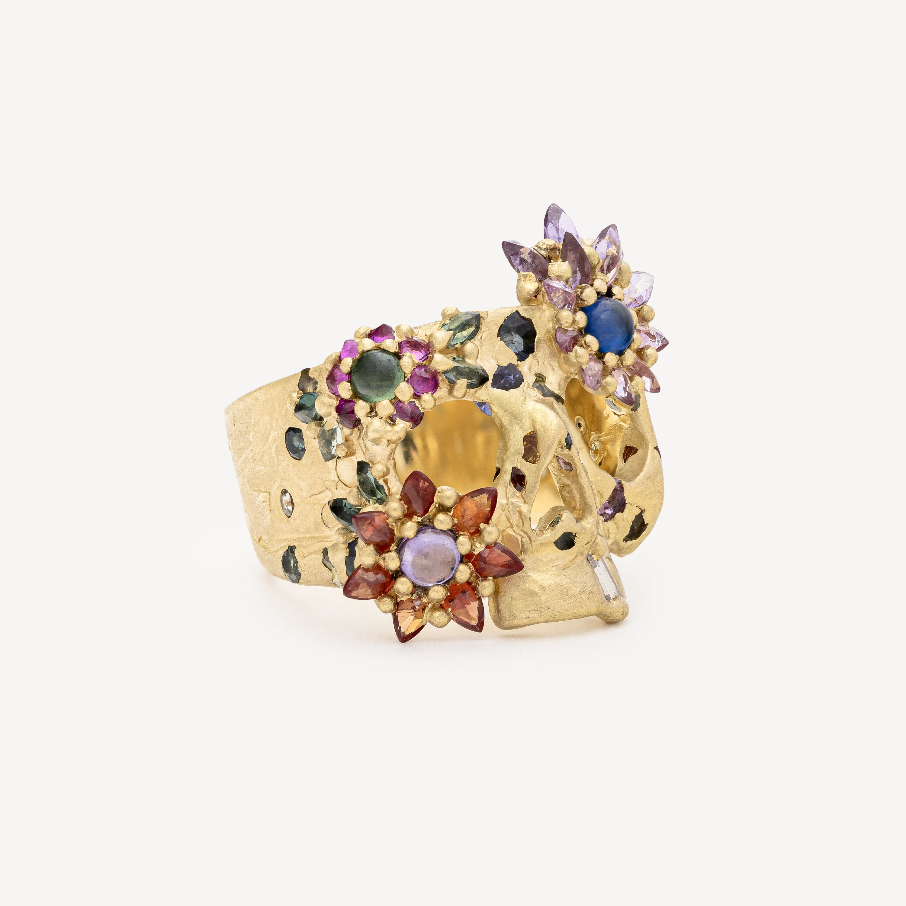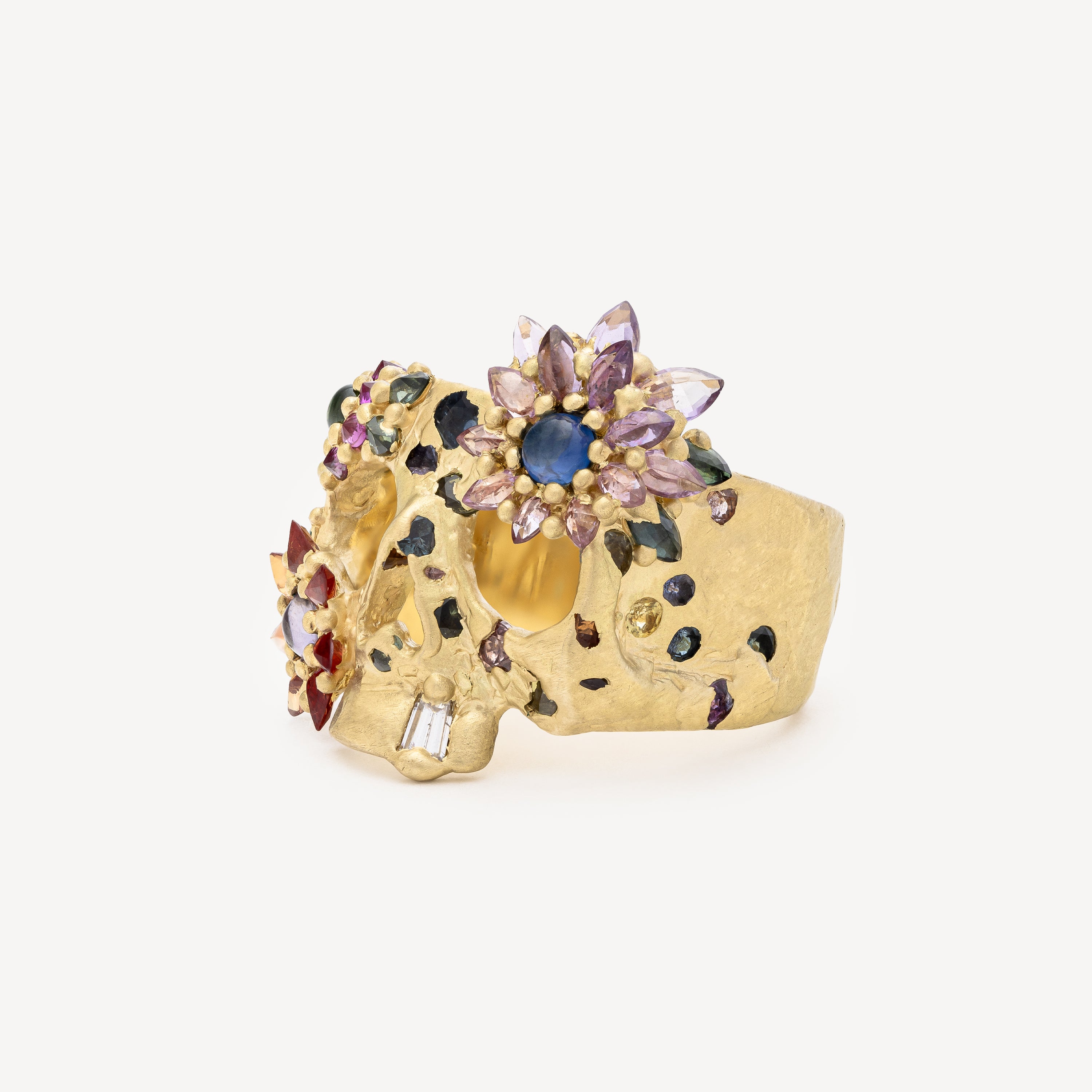 This imposing yellow gold ring is shaped like a skull. Encrusted entirely with sapphire, it adds a real touch of originality.