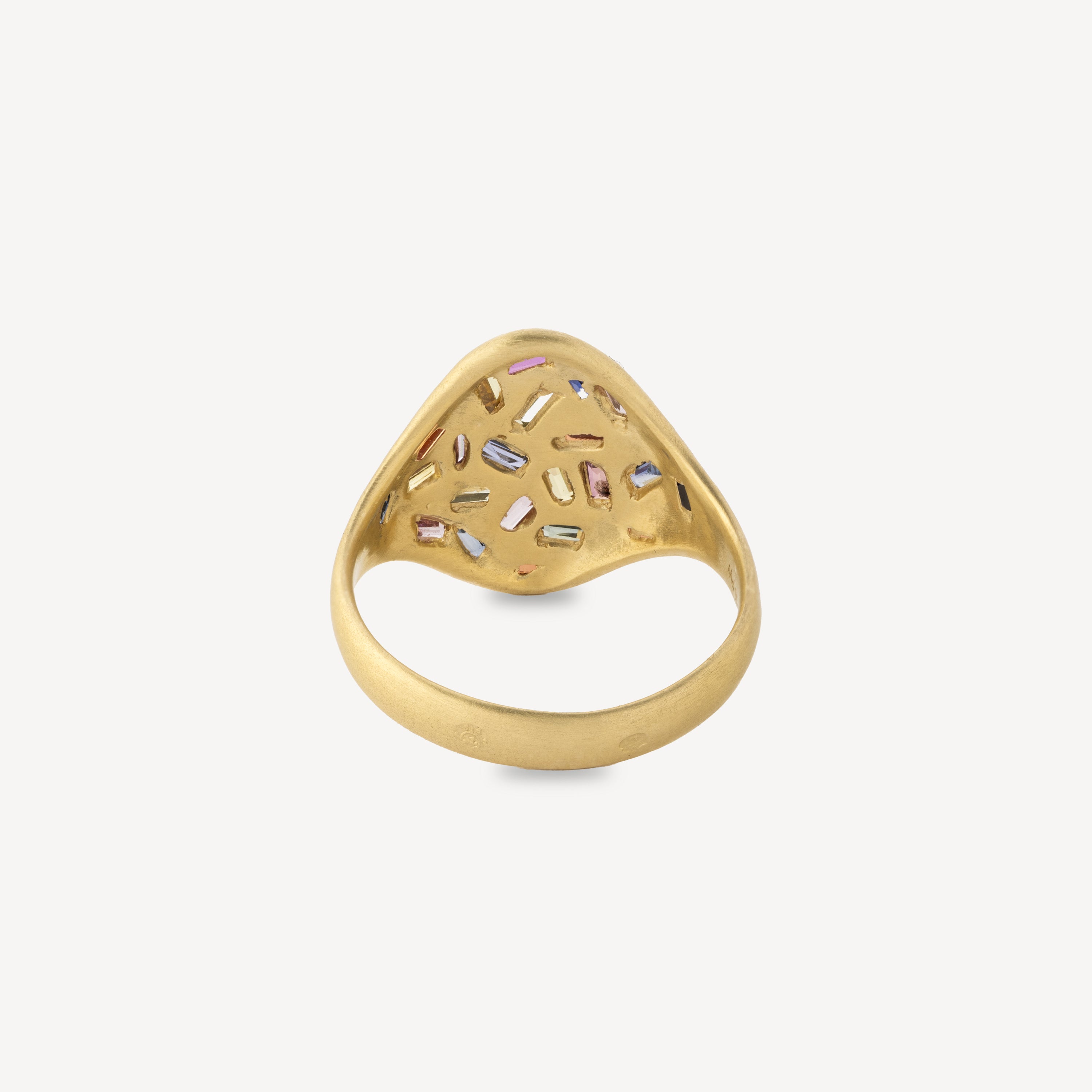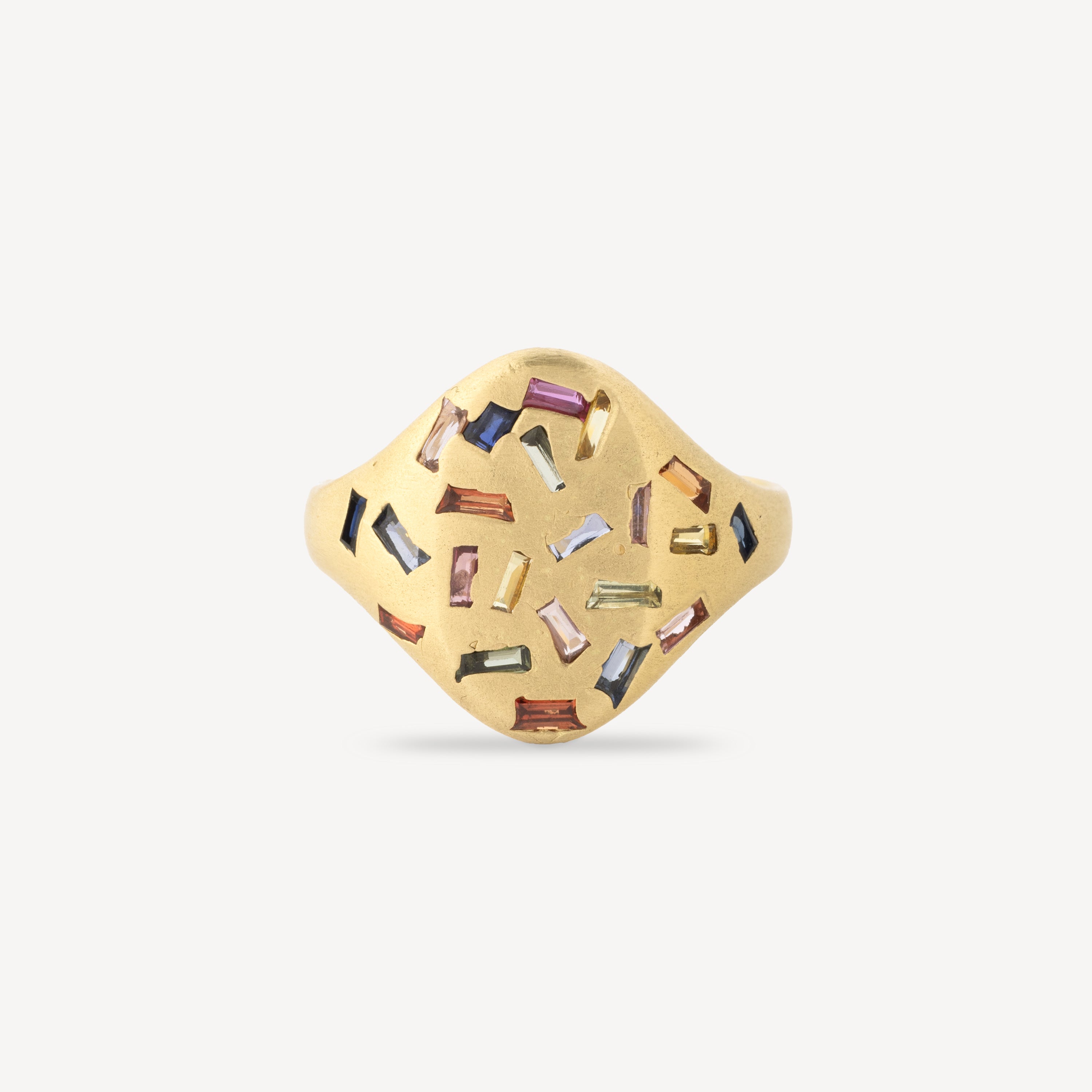 Explore the exquisite brilliance of rainbow-hued baguette sapphires, artfully embedded in a signet ring crafted from recycled 18k yellow gold. This piece subtly combines the shimmering brilliance of precious stones with the timeless nobility of metal, thus embodying a harmonious marriage between distinguished luxury and a warm and accessible touch.