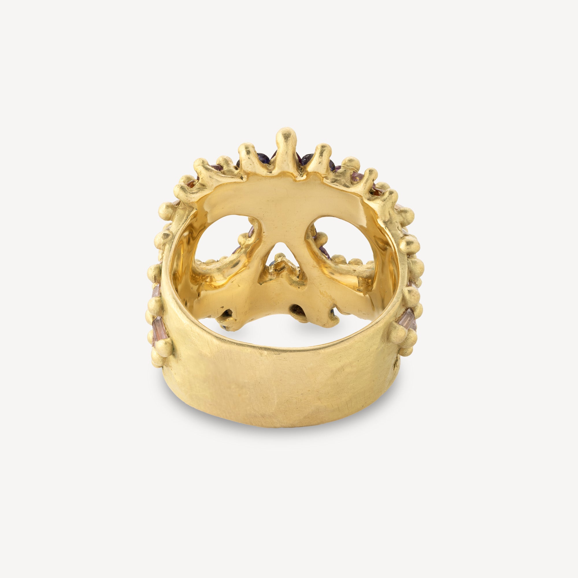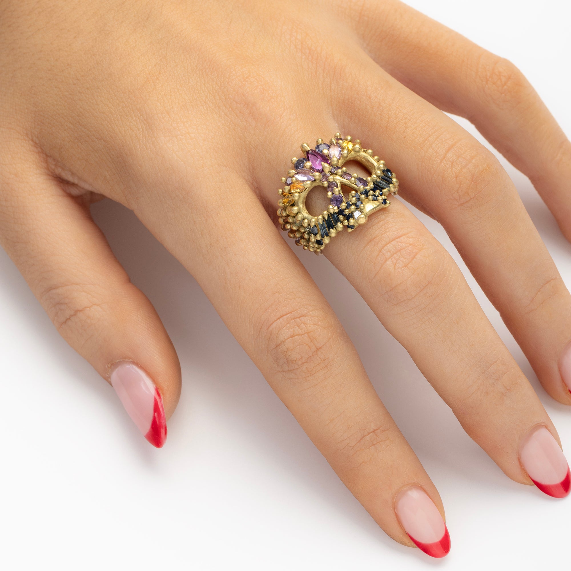 Explore the bold elegance of this skull ring, adorned with Blossom Crush sapphires and a snaggletooth baguette diamond, creating a unique alliance between luxurious exclusivity and singular style. This delicately crafted masterpiece embodies wild and sophisticated beauty. The recycled 18-carat yellow gold that adorns it adds a touch of authenticity to this remarkable creation, while inviting you to dive into a world where modernity and elegance merge in complete conviviality.