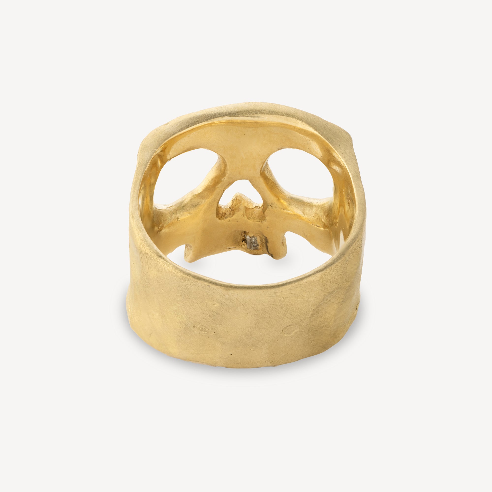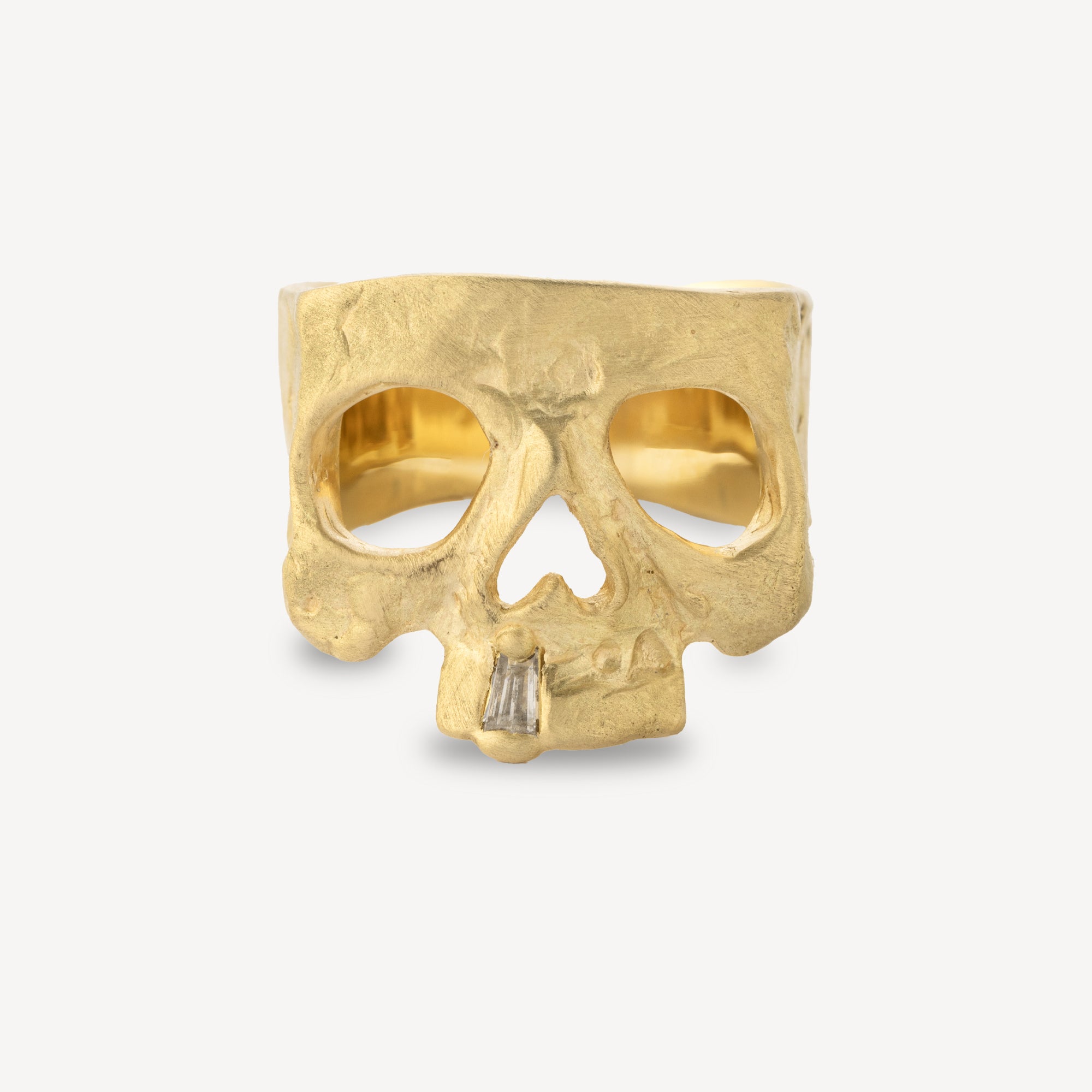 Explore the exquisite uniqueness of the iconic skull ring, adorned with a white diamond baguette delicately set in an 18k recycled yellow gold setting. This creation elegantly fuses the bold symbolism of the skull with the timeless brilliance of the diamond, thus embodying a subtle marriage between refined luxury and a touch of originality.