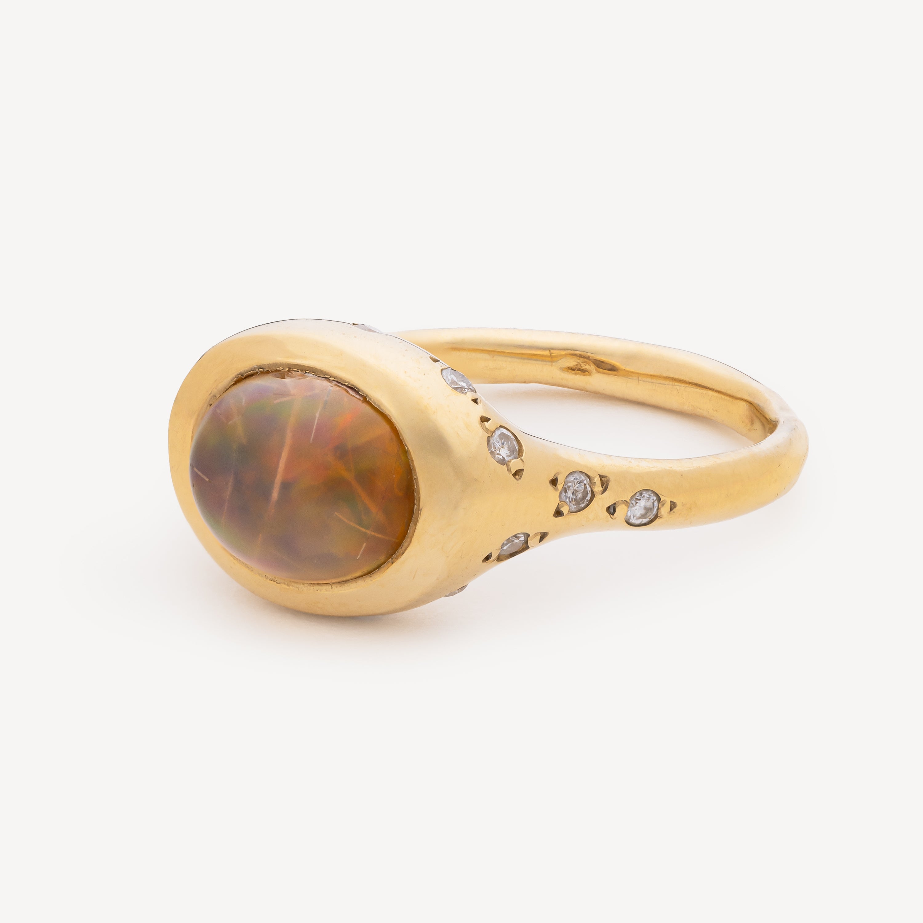 Dive into cosmic elegance with the Interstellar Opal Diamond Ring. Set with a mesmerizing opal in the center and accented with delicate diamonds.