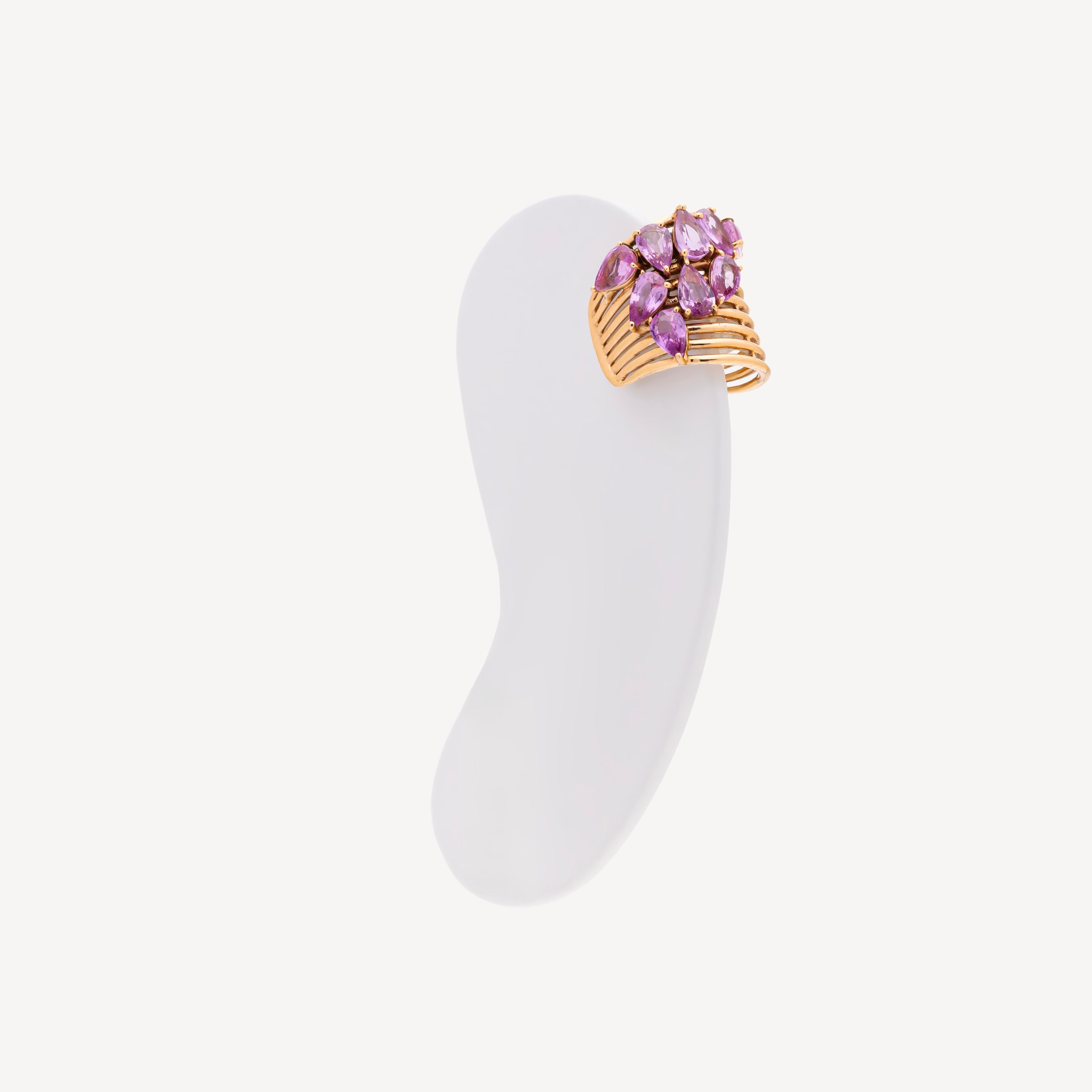 Cette ear cuff associe un cluster de saphirs roses en forme de poire à une inspiration florale, offrant un design élégant et raffiné qui sublime l’oreille avec délicatesse.