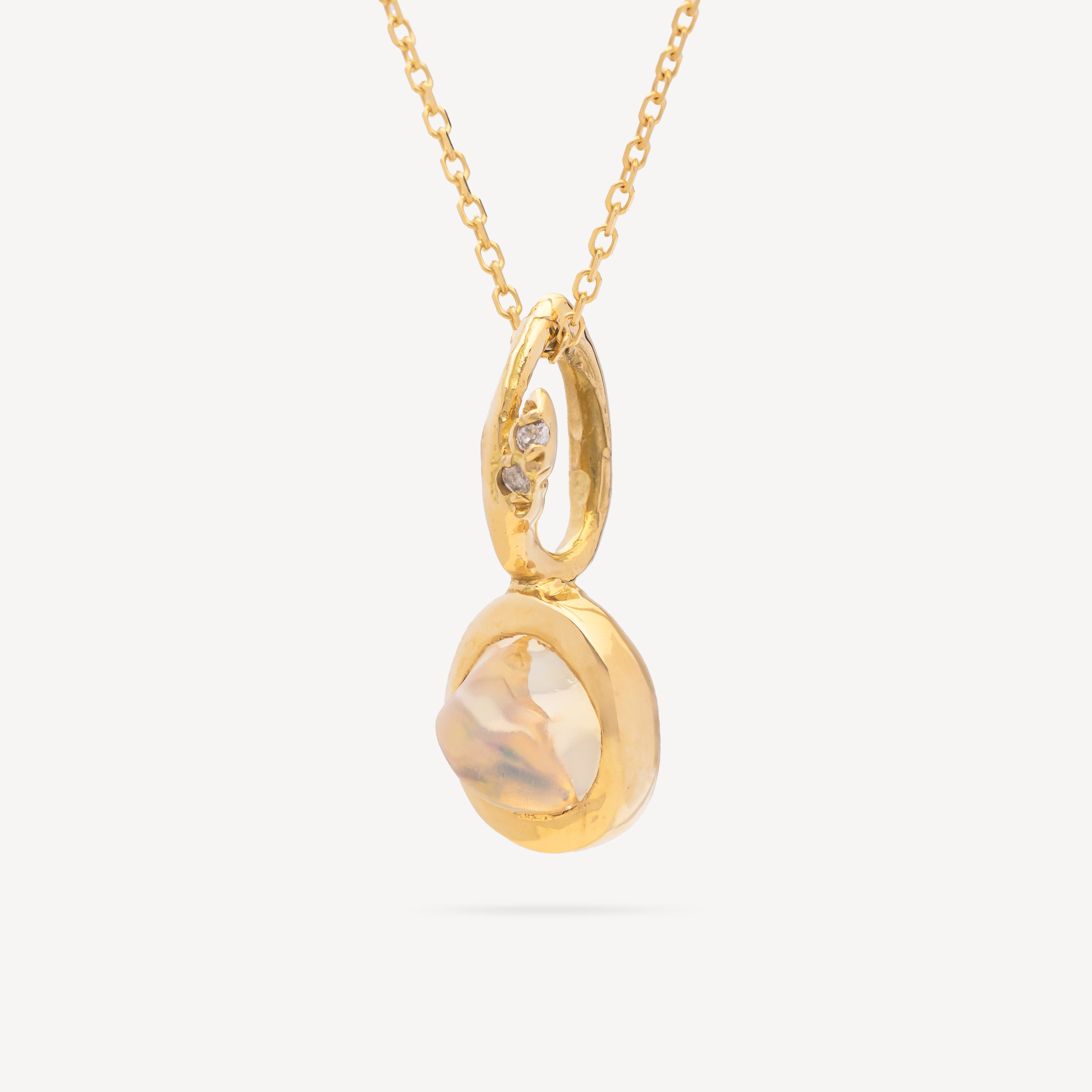 The Drop Charm Water Opal pendant, adorned with a sparkling opal and mounted on a gold chain, brings elegance and brightness to your daily life.