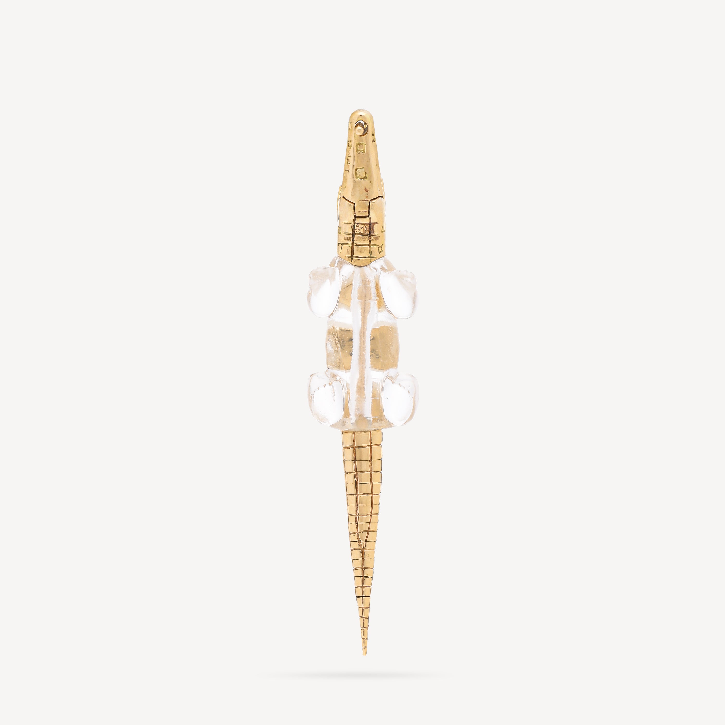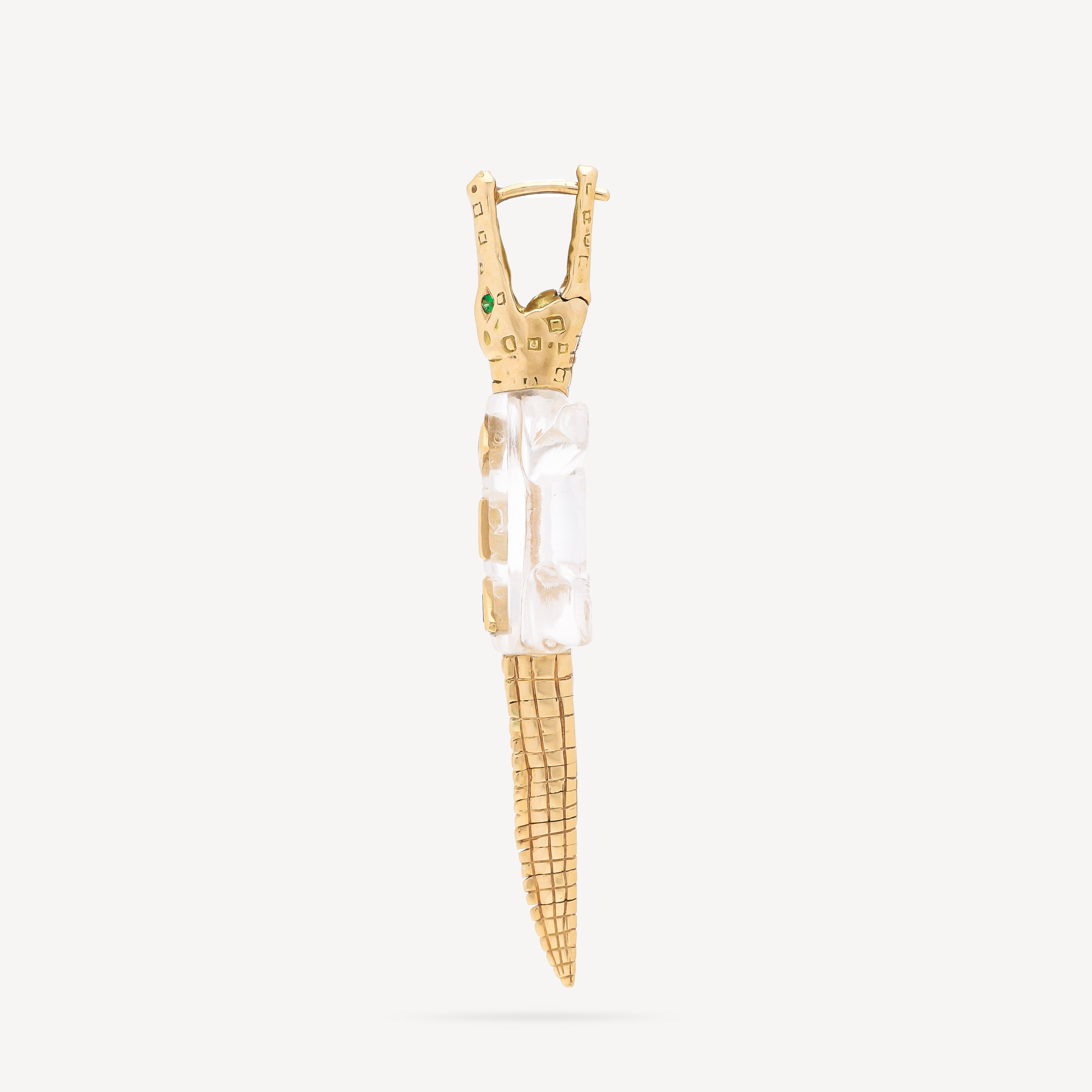 This alligator-shaped earring is made of white quartz and numerous sapphires.